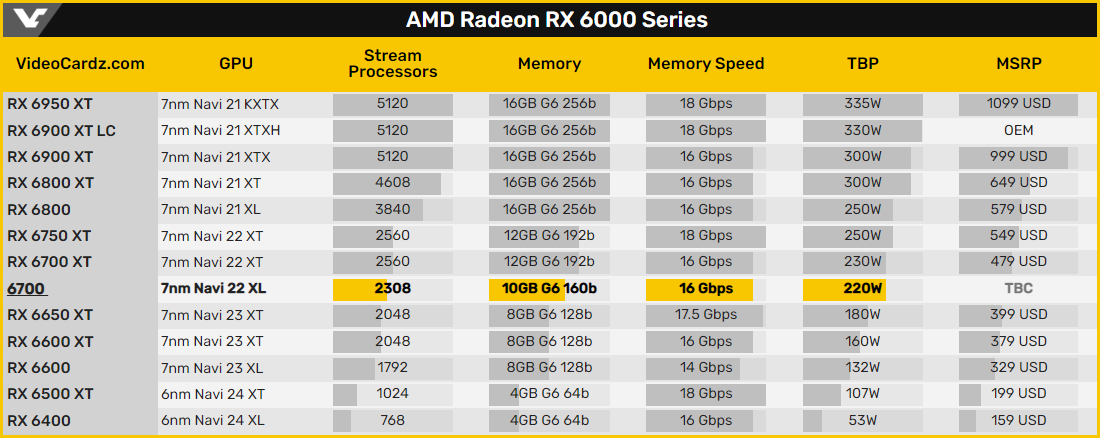 В основе Radeon 6700 лежит урезанный графический процессор AMD Navi 22. Он оперирует 36 модулями Compute Units (2304 потоковых процессора), 80 мегабайтами Infinity Cache и 160-разрядным интерфейсом памяти, через который GPU взаимодействует с десятью гигабайтами GDDR6.