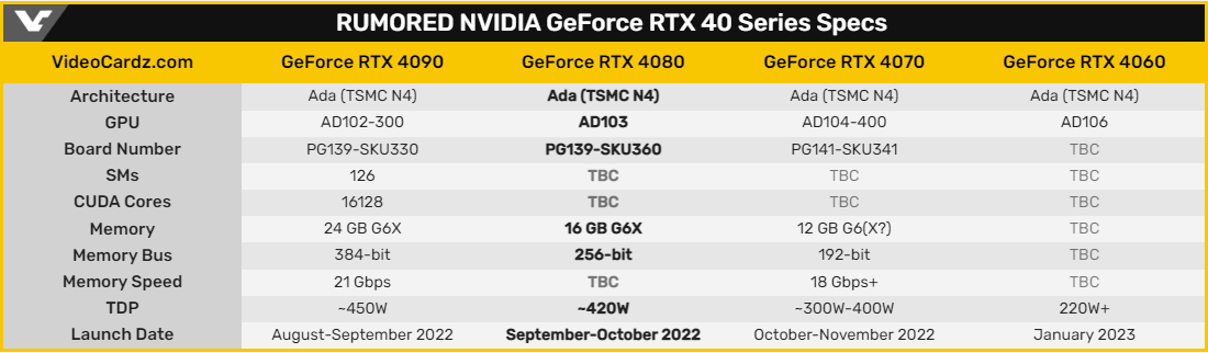 Известный инсайдер Kopite7kimi поделился новой информацией о будущих видеокартах Nvidia Ada Lovelace. На этот раз речь идет о GeForce RTX 4080. Kopite7kimi утверждает, что мощность TGP (Total Graphics Power) этой видеокарты составит 420 Вт, что не сильно отличается от 450 Вт у GeForce RTX 4090. Примечательно, что это на 100 Вт выше мощности GeForce RTX 3080. Также мы недавно писали, что GeForce RTX 4060 прочат мощность в 220 Вт.