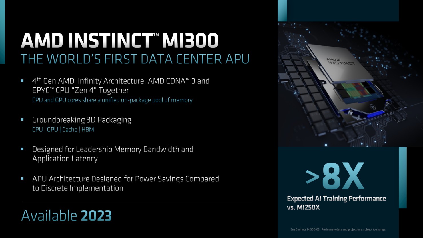 Благодаря такому подходу AMD рассчитывает в разы увеличить производительность относительно актуальных ускорителей Instinct MI200. Выпуск отдельных микросхем будет осуществляться по 5-нм технологии, причём на слайде компания отмечает использование трёхмерной компоновки. Релиз ускорителей вычислений AMD Instinct MI300 запланирован на следующий год.