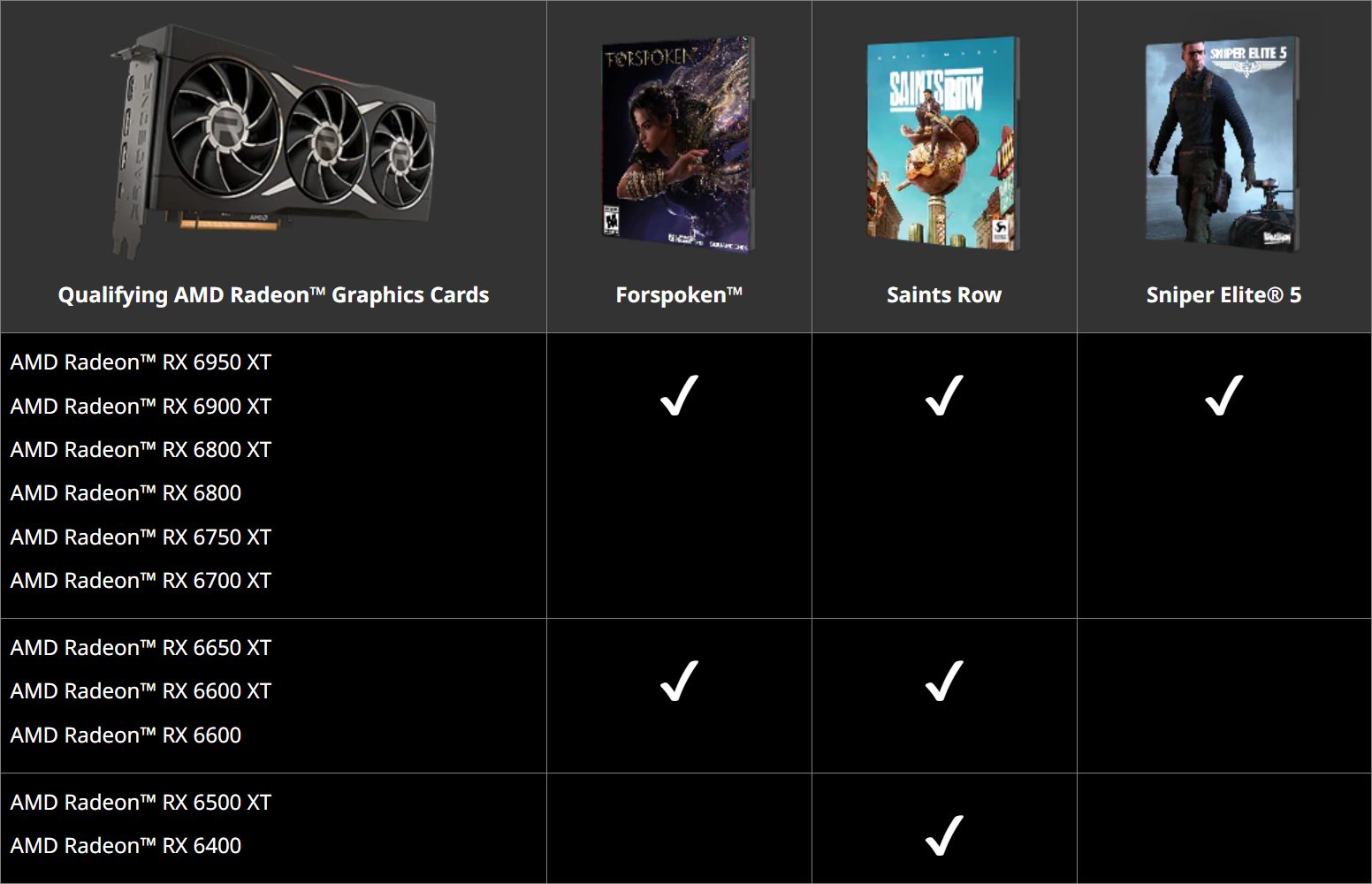 На все три проекта могут претендовать покупатели видеокарт уровня от Radeon RX 6700 до Radeon RX 6950 XT. Игры Forspoken и Saints Row можно будет получить при покупке 3D-ускорителей Radeon RX 6600, RX 6600 XT и RX 6650 XT. В то же время новоиспечённым владельцам моделей Radeon RX 6400 и RX 6500 XT достанется только бесплатная копия Saints Row.