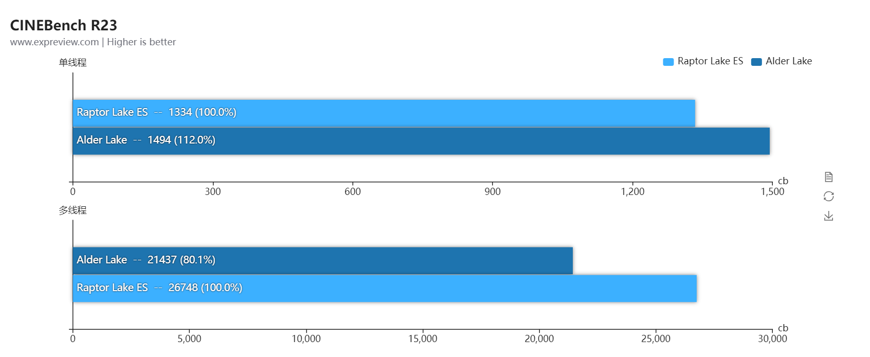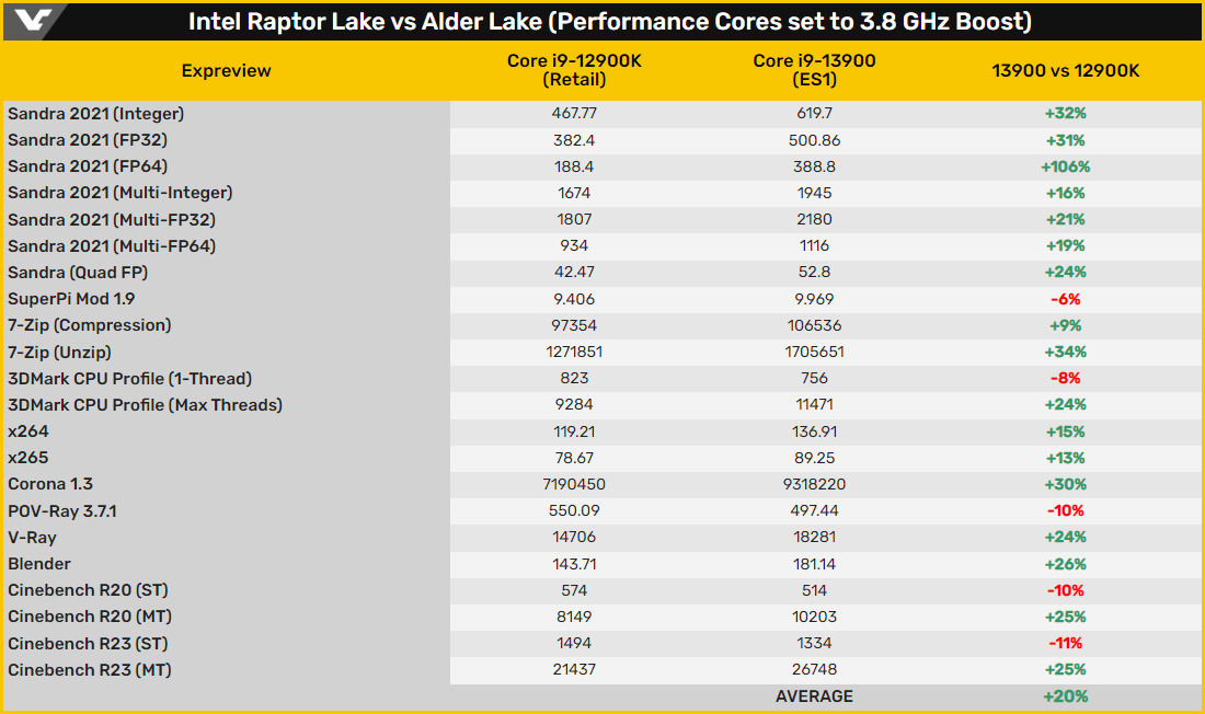 Что касается быстродействия, то, к примеру, в Cinebench R20 и R23 инженерная версия Core i9-13900 по однопоточной производительности проигрывает Core i9-12900K примерно на 10%, однако на 25% быстрее в многопоточных тестах. В игровых бенчмарках процессоры выступили почти на равных. Учитывая нестабильные частоты Raptor Lake-S и прочие негативные факторы, результаты выглядят многообещающе.