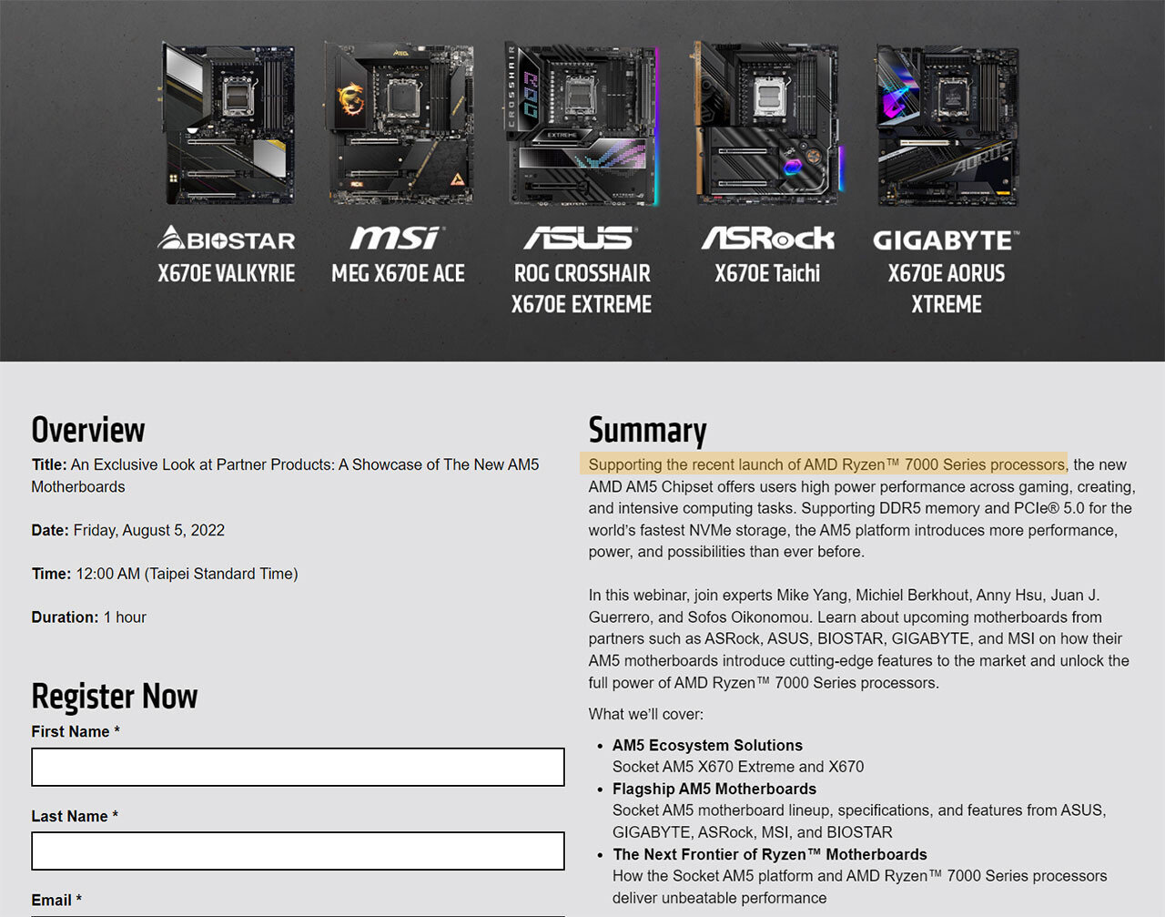Учитывая, что подобные мероприятия зачастую следуют за анонсом новых продуктов, процессоры Ryzen 7000 (Raphael) и платформа AM5 будут представлены четвёртого августа или даже раньше. К таком выводу можно прийти и на основе описания следующего Meet The Experts, где среди прочего указана «Поддержка недавнего запуска процессоров AMD Ryzen 7000-й серии». Главной темой презентации станут флагманские платы AM5/X670(E) от ASRock, ASUS, Biostar, Gigabyte и MSI.