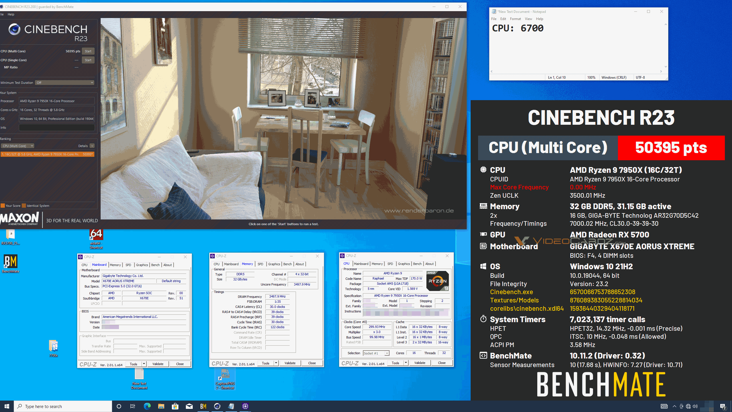 Во-первых, Sampson выложил на HWBOT пару результатов Ryzen 9 7950X в дисциплинах Cinebench R20 и Cinebench R23 на частоте 6450 МГц и 6513 МГц. Но что более интересно, другой энтузиаст Zed3 поделился еще одним скриншотом, на котором указана максимальная частота 6700 МГц и результат в Cinebench R23 на уровне 50 395 очков.
