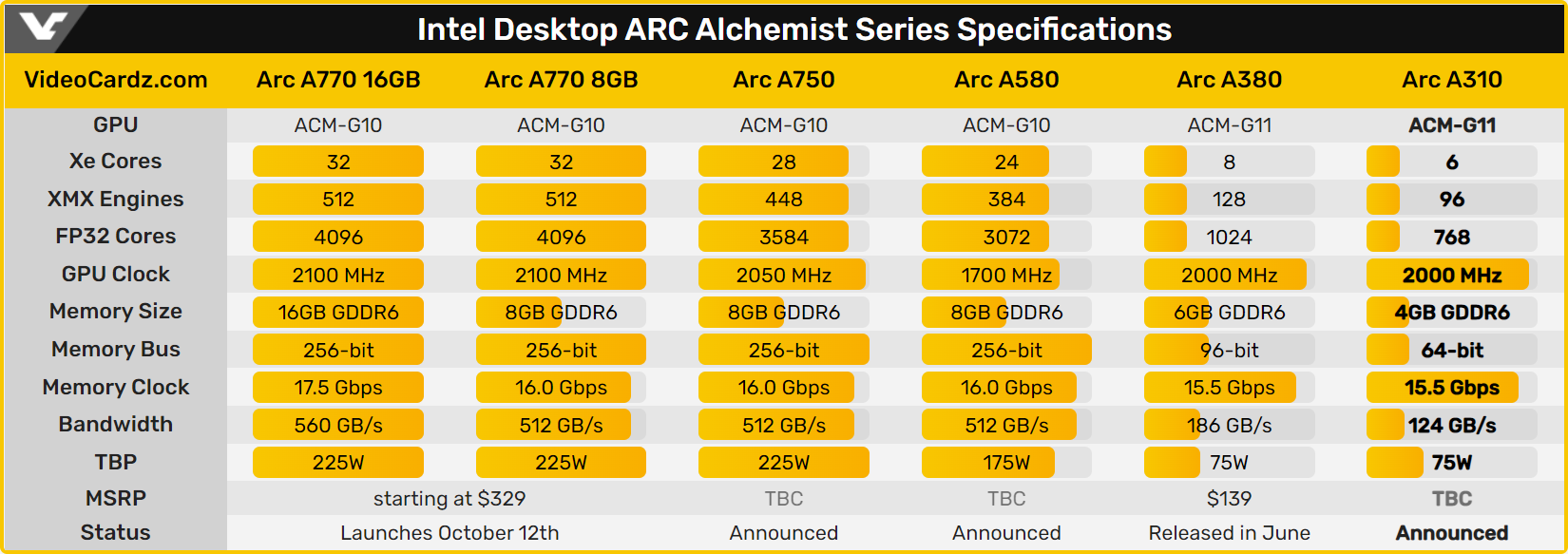 Видеокарта Intel Arc A310 получила шесть Xe-ядер или 768 потоковых процессоров, 64-битный интерфейс памяти и видеобуфер GDDR6 объёмом 4 ГБ. Тактовая частота GPU составляет 2000 МГц, видеопамять функционирует на 15,5 ГГц (эффективных), обеспечивая пропускную способность 124 Гбайт/с. Штатный уровень TBP составляет 75 Вт.