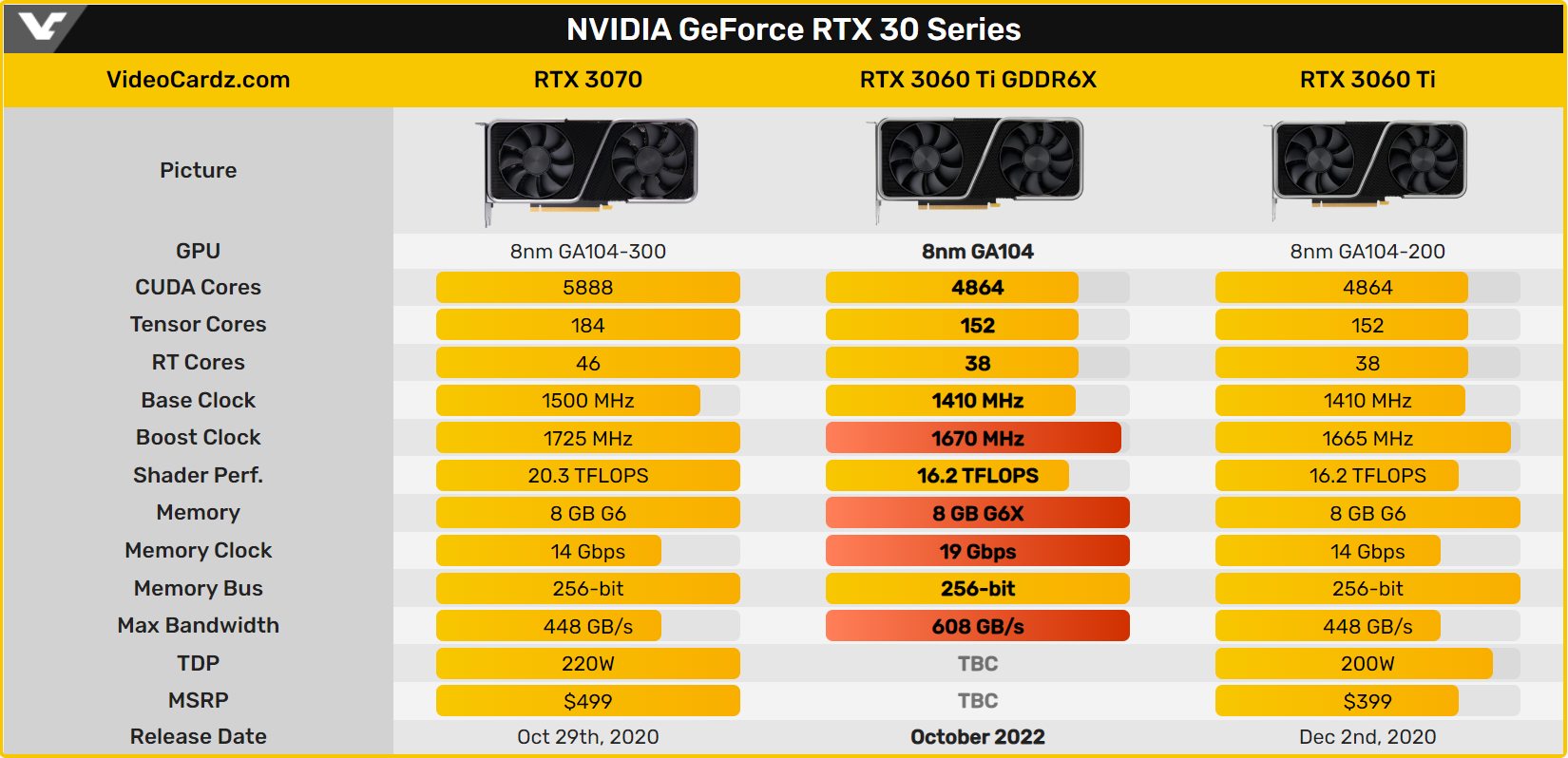 Конфигурацию графического процессора GeForce RTX 3060 Ti GDDR6X полностью унаследует от предшественницы: 4864 ядра CUDA, 152 тензорных, 38 RT-ядер и 256-битный интерфейс памяти. В то же время пропускная способность видеобуфера за счёт использования чипов GDDR6X с эффективной частотой 19 ГГц вырастет с 448 до 608 Гбайт/с. Таким же показателем обладает GeForce RTX 3070 Ti.