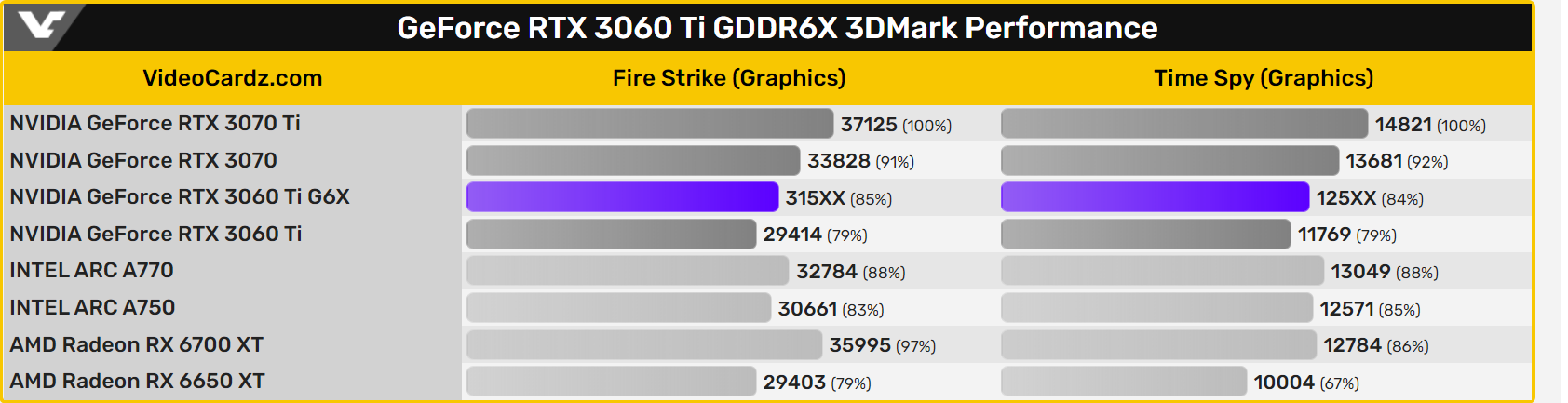 Обновлённая GeForce RTX 3060 Ti получит микросхемы GDDR6X с эффективной частотой 19 ГГц, благодаря чему пропускная способность видеобуфера вырастет с 448 до 608 Гбайт/с. Таким же показателем обладает GeForce RTX 3070 Ti. В результате производительность новинки будет минимум на 7% выше, чем у обычной GeForce RTX 3060 Ti. По крайней мере, об этом свидетельствуют результаты в тестовом пакете 3DMark.