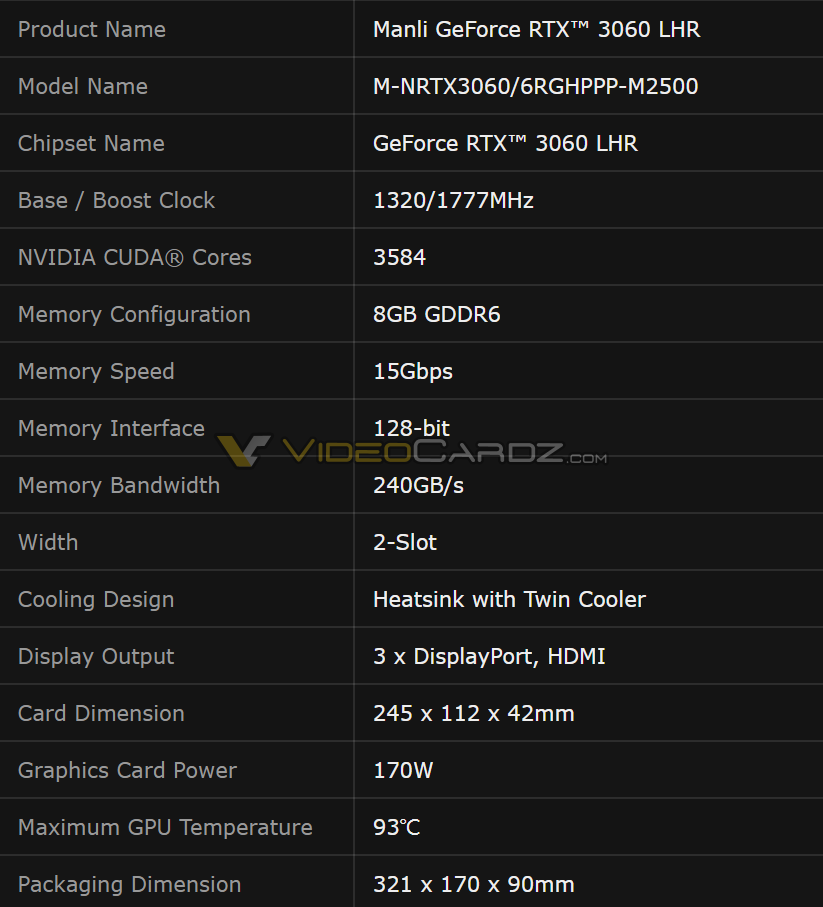 В случае новинки Manli используется та же система охлаждения, что и у 12-гигабайтной модификации GeForce RTX 3060. Графический процессор функционирует на частоте от 1320 до 1777 МГц в динамическом разгоне, а паспортный уровень TGP равен 170 Вт.