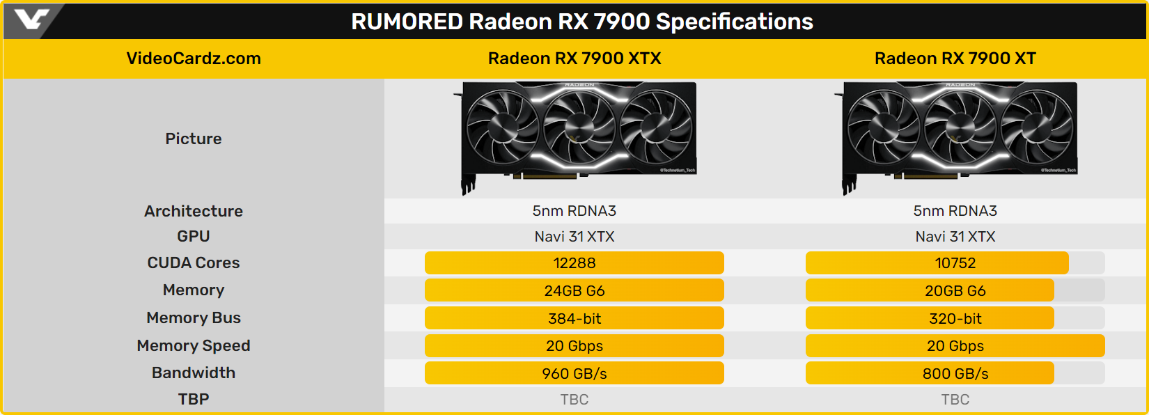 Дебютными видеокартами семейства RDNA 3 станут модели Radeon RX 7900 XTX и Radeon RX 7900 XT. Оба 3D-ускорителя базируются на графическом процессоре Navi 31. Компания AMD ранее подтвердила, что в новом GPU будет применена многочиповая компоновка, а неофициальные источники приписывают ему наличие одного крупного кристалла GCD (Graphics Complex Die) и шести чиплетов Memory Complex/Controller Die (MCD).