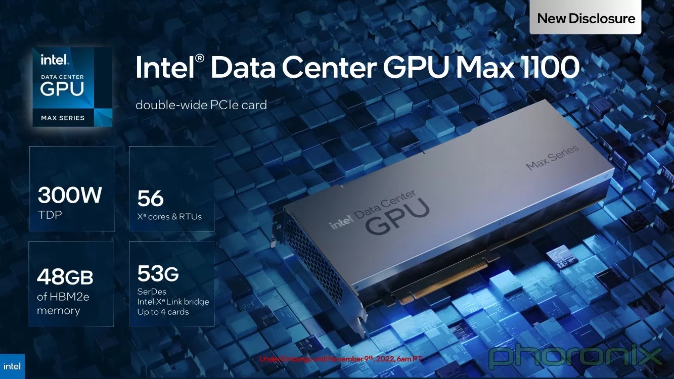 - Max Series 1100 GPU: 300-ваттная карта расширения PCI-E с 56 Xe-ядрами и 48 ГБ памяти HBM2e;