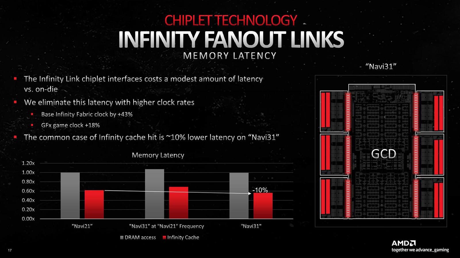 В графическом процессоре Navi 31 буфер Infinity Cache находится за пределами главного кристалла Graphics Compute Die. Такая компоновка принесла с собой повышение задержек доступа к памяти. Для компенсации негативных эффектов компания AMD на 43% увеличила частоту шины Infinity Fabric, а также на 18% подняла показатель Game Clock. В результате задержки Infinity Cache сократились на 10% относительно GPU Navi 21, используемого в топовых картах Radeon RX 6000.