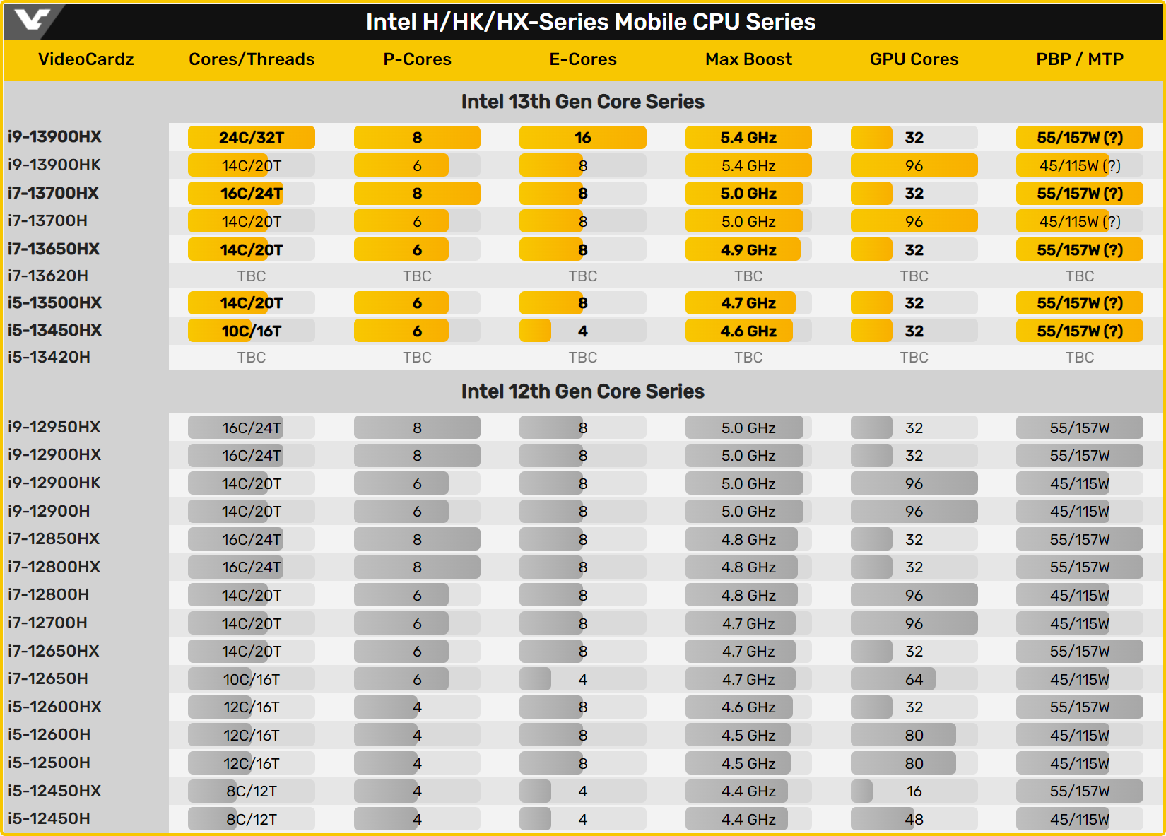 Флагманский Intel Core i9-13900HX сможет предложить 8 высокопроизводительных ядер Raptor Cove и 16 энергоэффективных ядер Gracemont. Его оснащение также включает 36 Мбайт кэша третьего уровня, контроллер памяти DDR4-3200/DDR5-5600 и графический блок Xe-LP. Частота P-ядер в режиме Turbo Boost будет достигать 5,4 ГГц. С предварительными характеристиками мобильных CPU Raptor Lake можно ознакомиться в таблице ниже.