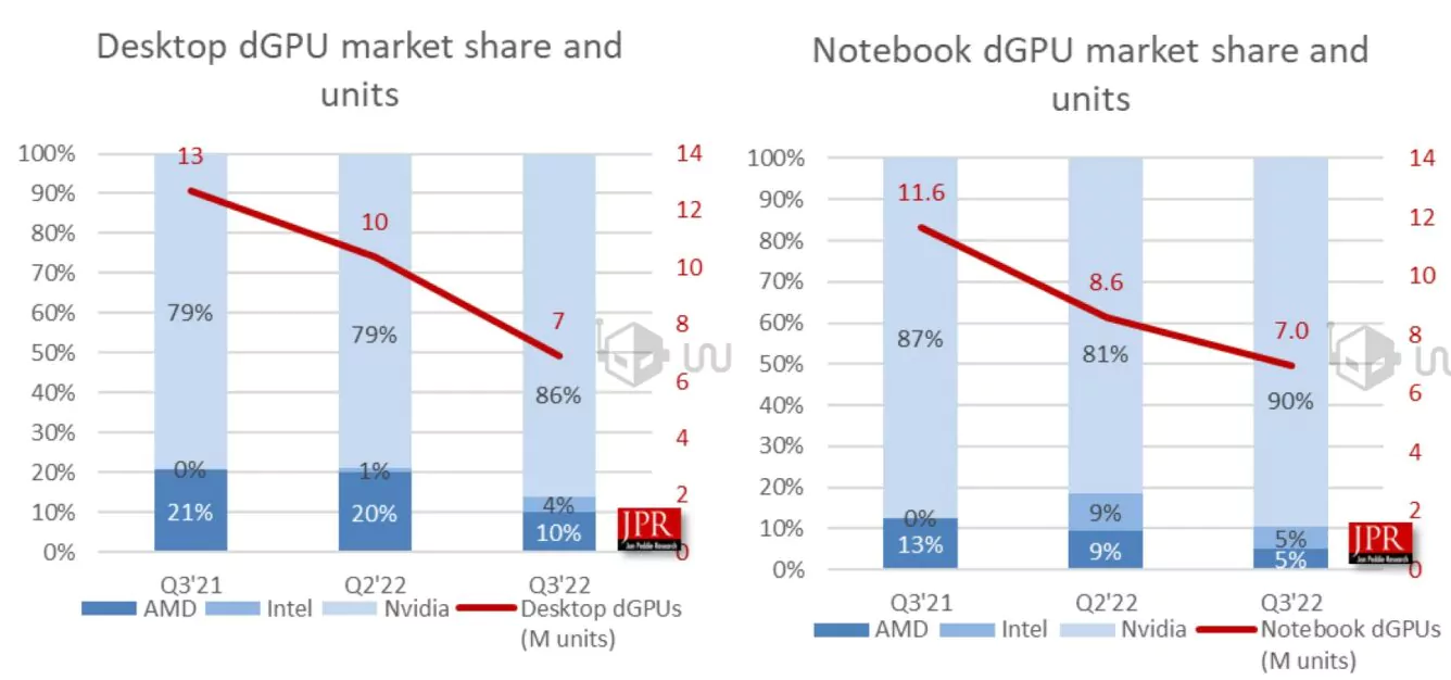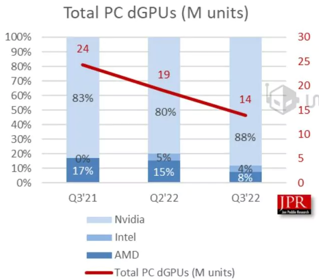 Веб-ресурс WCCFTech поделился новыми сведениями из доклада Jon Peddie Research (JPR) о ситуации на рынке графических ядер. Эксперты JPR уже отмечали, что в третьем квартале поставки видеоядер для персональных компьютеров упали на 25,1%. Однако в сегменте дискретных GPU ситуация обстоит ещё хуже.