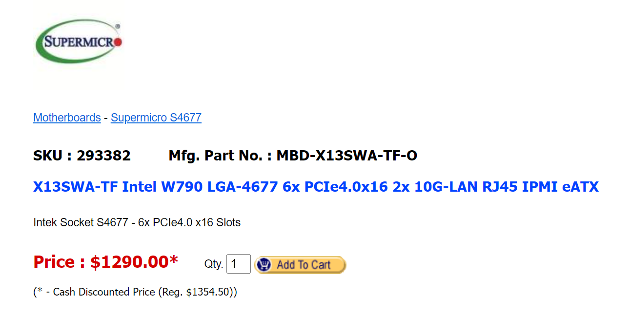Оснащение платы Supermicro X13SWA включает шесть слотов расширения PCI Express 4.0 x16, то есть поддержка интерфейса PCI-E 5.0 в новых HEDT-процессорах не предусмотрена, и два 10-гигабитных сетевых интерфейса. Форм-фактор новинки — Extended ATX. В канадском онлайн-магазине за неё просят примерно 963 доллара США.