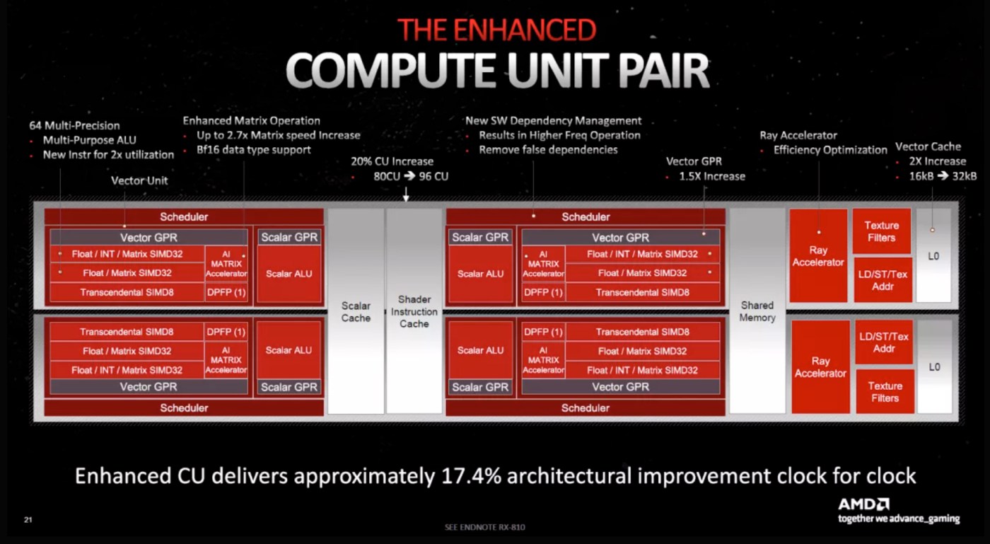 В основном режиме wave32 две инструкции FMA 32 имеют доступ к одному регистру vGPR. Даже в расширенном режиме wave64 пиковая производительность составляет 5/6 от теоретического максимума. Журналисты hardwaretimes даже получили официальный комментарий от представителя AMD, в котором отмечается, что по мере улучшения компилятора, осуществляющего упаковку инструкций Wave32 в специальную кодировку VOPD, производительность будет улучшаться. Также внедрение более сложного реалистичного рендеринга может привести к появлению кода, который использует Wave64 и задействует все доступные ALU.