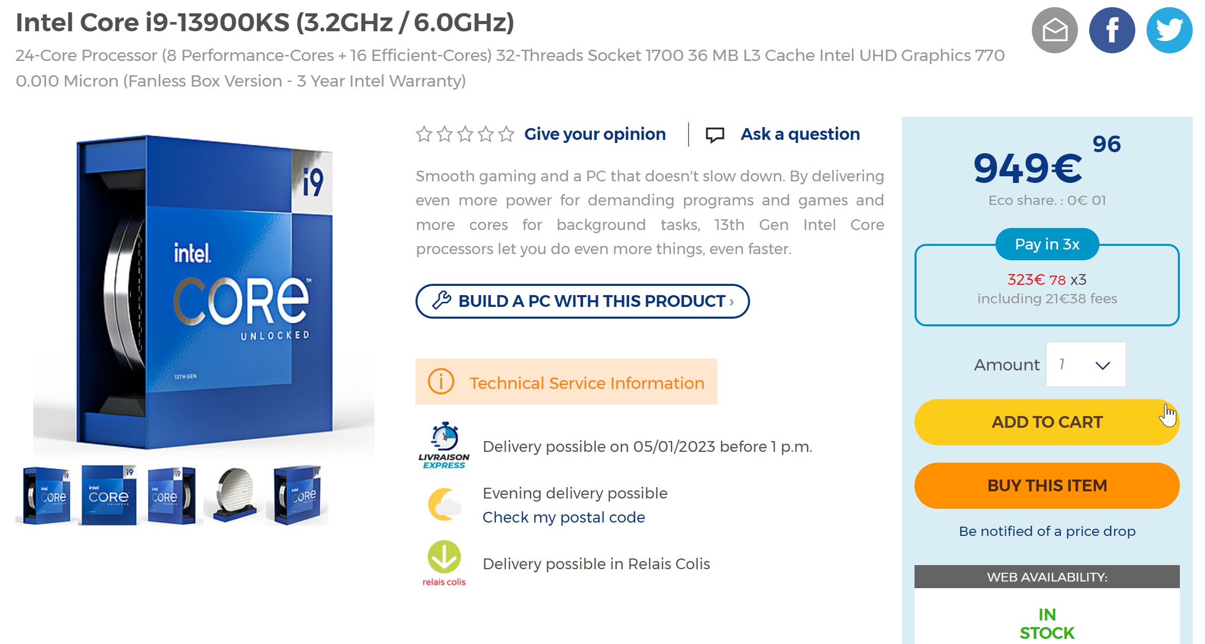 Во Франции за процессор Intel Core i9-13900KS придётся выложить около 950 евро. Это на €180 больше, чем просят модель Core i9-13900K в том же магазине. Напомним, что Intel на днях повысила рекомендованные цены процессоров для настольных ПК — в среднем CPU подорожали на 10%. Будущего флагмана платформы LGA1700 это тоже затронуло.