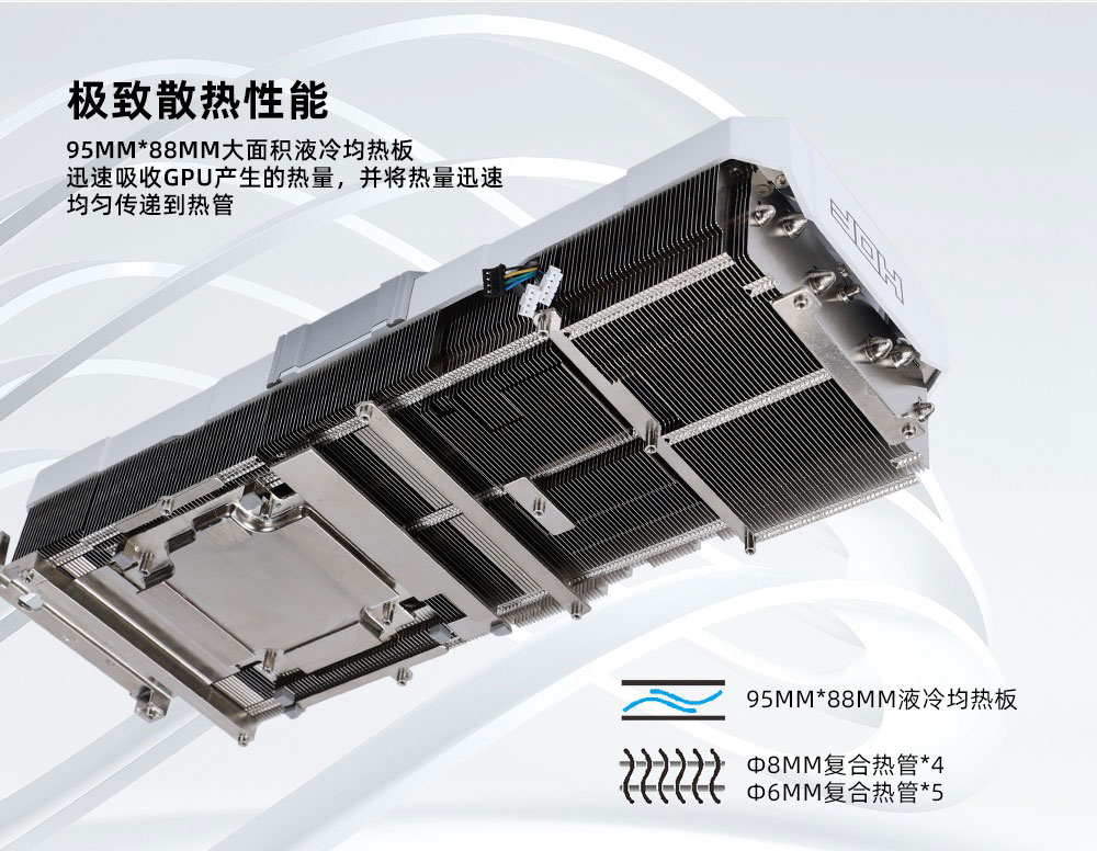 Видеокарта Galax GeForce RTX 4070 Ti HOF OC Lab (Plus) оснащена массивной системой охлаждения с тремя вентиляторами: одним 92-мм и двумя 112-мм. Радиатор выполнен на базе испарительной камеры, четырёх 8-мм и пяти 6-мм теплотрубок. На торце графической карты распаян разъём 12VHPWR, а комплект поставки включает переходник на три 8-контактных PCI-E Power. Габариты устройства составляют 344 x 144 x 77 мм.