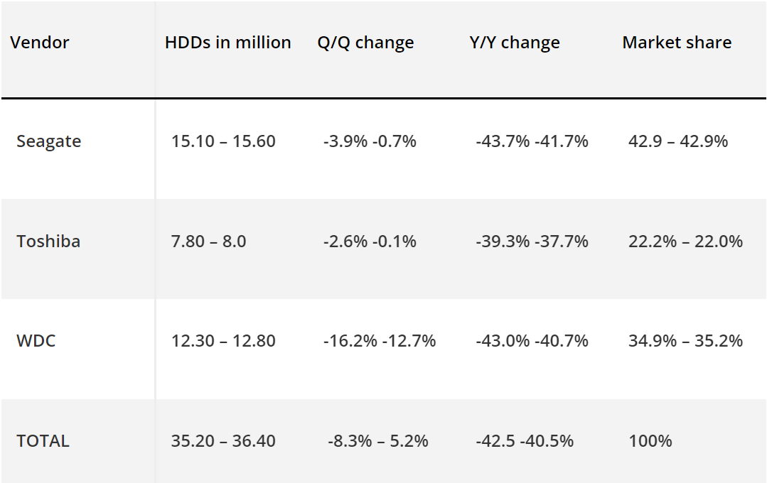 Лидером рынка остаётся компания Seagate, которая отгрузила в прошлом году примерно 15,1-15,6 миллионов жёстких дисков. Это на 41,7-43,7% меньше, чем годом ранее. Второе место принадлежит Western Digital — за 2022 год она поставила в районе 12,3-12,8 миллионов HDD (-40,7-43,0% относительно 2021-го), а корпорация Toshiba завершила прошлый год с показателем около 7,8-8,0 миллионов устройств (-37,7-39,3%).