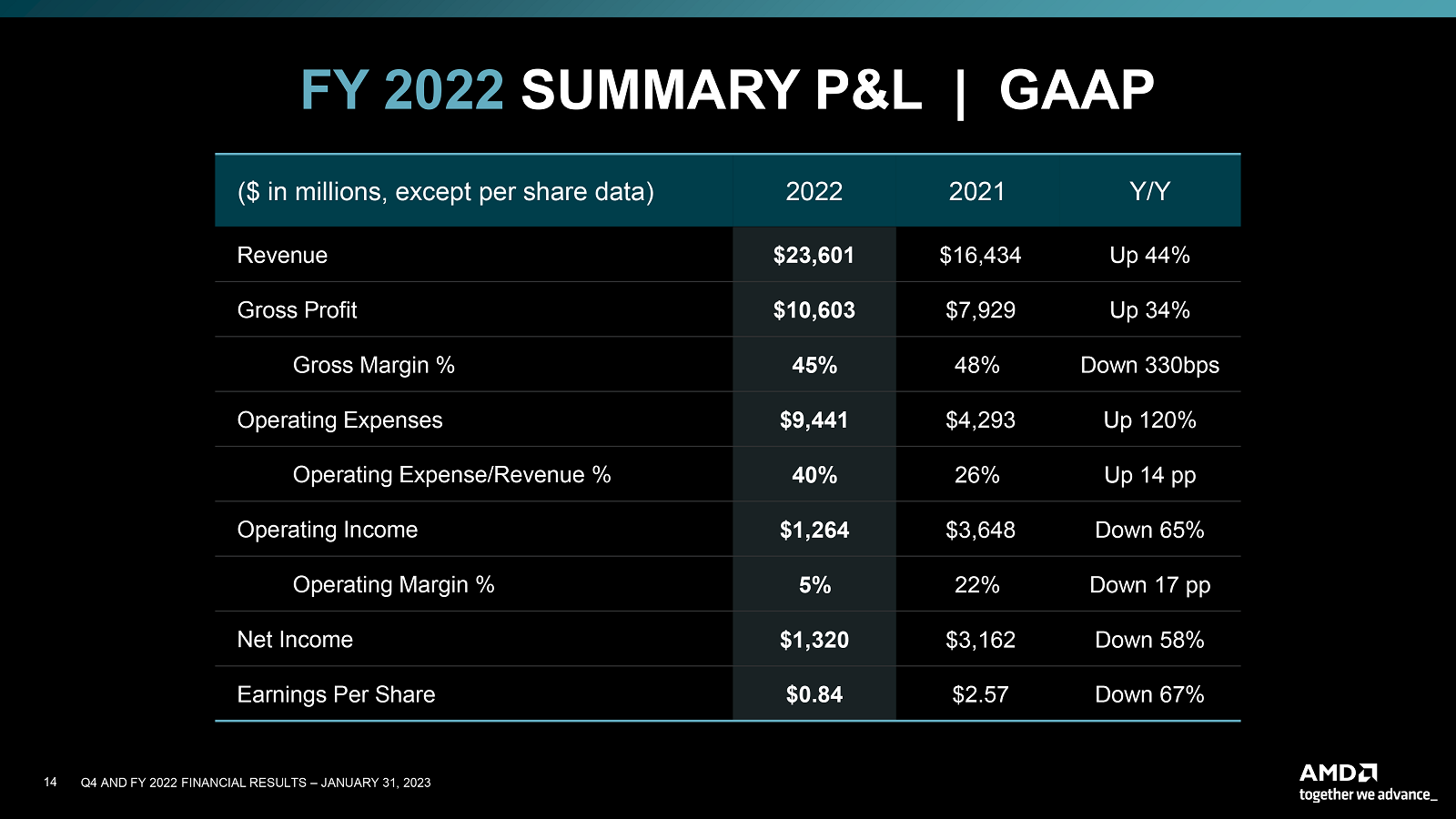 Для компании AMD прошлый год выдался весьма результативным. Выручка «красного» чипмейкера за этот период составила $23,6 млрд, что на 44% больше показателей 2021-го и является новым рекордом компании. Правда, вместе с этим чистая прибыль упала на 58% — с $3,16 млрд до $1,32 млрд.