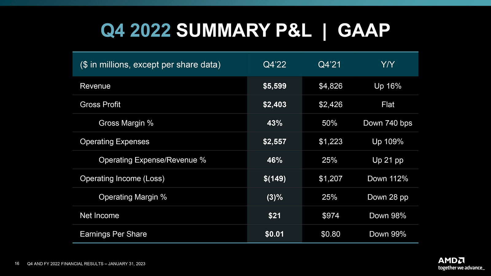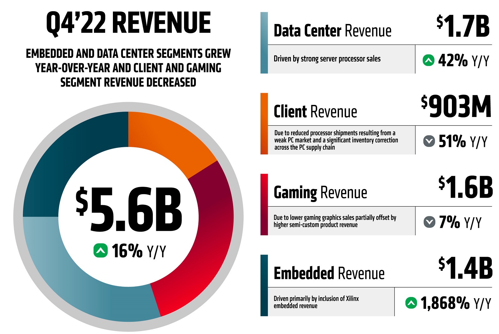 В четвёртом квартале AMD столкнулась с падением спроса на процессоры и наборы логики для персональных компьютеров. Выручка соответствующего подразделения упала до $903 миллионов. Серверное направление принесло компании $1,7 млрд, игровое подразделение отчиталось о $1,6 млрд выручки, а подразделение, которое специализируется на встраиваемых решениях, завершило квартал с $1,4 млрд.