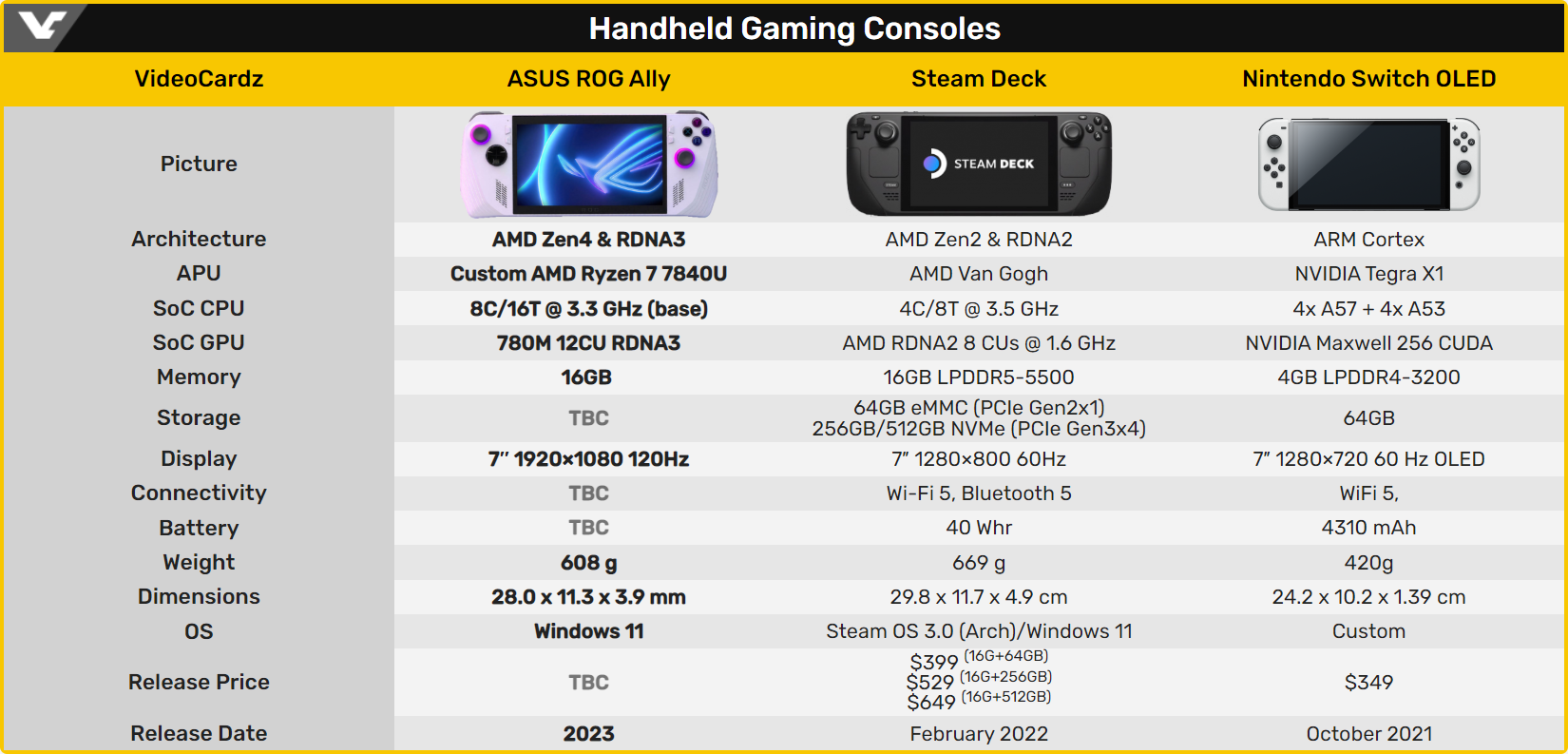 Обычный вариант Ryzen 7 7840U имеет восемь ядер Zen 4 с поддержкой SMT и номинальной частотой 3,3 ГГц, а также встроенную графику Radeon 780M на 12 Compute Units. Его уровень TDP может быть настроен в диапазоне от 15 до 28 Вт. Оснащение ROG Ally также включает 16 Гбайт оперативной памяти LPDDR5, твердотельный накопитель формата M.2 2230 и разъём для подключения внешней видеокарты ROG XG Mobile.