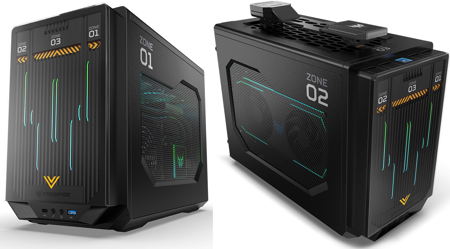 В ходе презентации next@acer состоялся анонс игрового десктопа Predator Orion X. Он выполнен в корпусе объёмом 15,4 литра, который разделён на три отдельные зоны. В первой размещены ключевые элементы системы (процессор, материнская плата и т.д.), во второй находятся видеокарта и пара 2,5-дюймовых накопителей, а в третьей — 240-мм радиатор жидкостной системы охлаждения CPU.