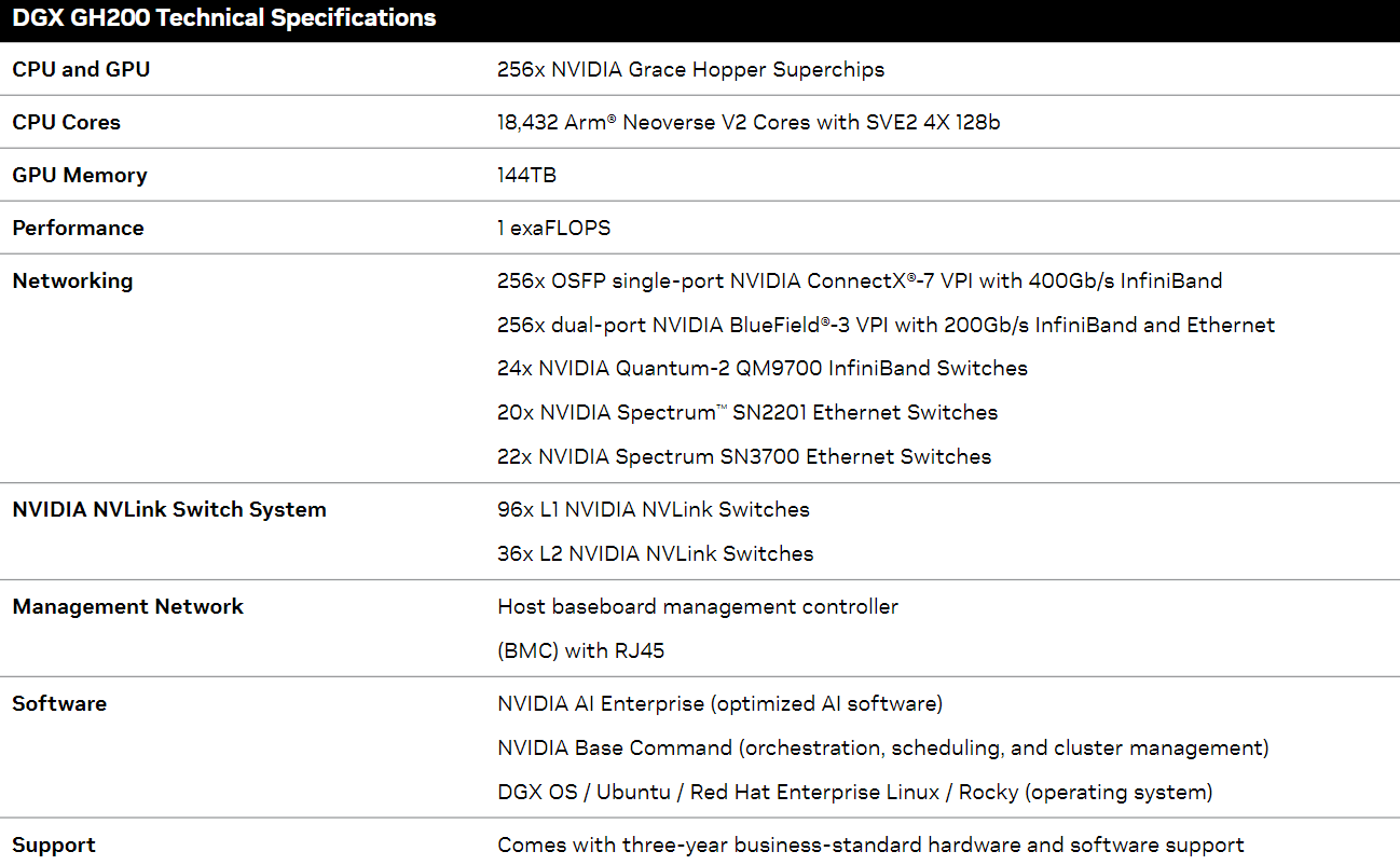 В суперкомпьютере DGX GH200 использованы сразу 256 суперчипов Grace Hopper, объединённых с помощью коммутаторов NVLink. Это высокоскоростное соединение позволяет ускорителям функционировать как единое целое, что очень важно при создании больших ИИ-моделей. Напомним, Grace Hopper Superchip представляет собой сборку из ARM-процессора Grace, GPU Hopper H100, 96 Гбайт памяти HBM3 и 480 Гбайт LPDDR5X.