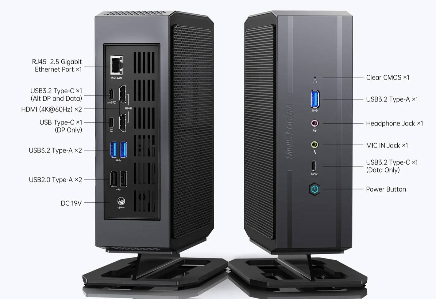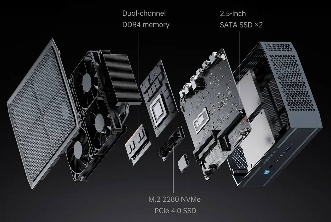 Оснащение Minisforum HN2673 включает два слота под модули оперативной памяти SO-DIMM DDR4 (максимальный объём 64 ГБ), разъём M.2 для NVMe SSD с поддержкой PCI-E 4.0 x4 и два порта SATA 6 Гбит/с для 2,5-дюймовых накопителей. Также стоит отметить 2,5-гигабитный сетевой интерфейс, беспроводной модуль Wi-Fi 6E/Bluetooth 5.3 и систему охлаждения с четырьмя вентиляторами.
