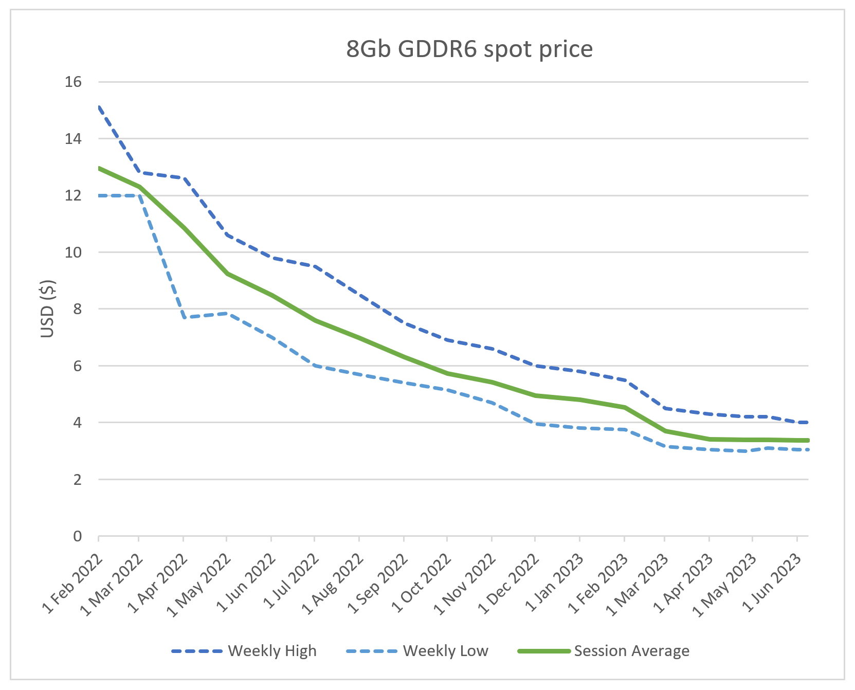За последние несколько кварталов на рынке памяти DRAM утвердилась тенденция к снижению стоимости микросхем. В том числе она затронула сегмент графической памяти GDDR. К примеру, по сравнению с началом 2022 года 8-гигабитные чипы стандарта GDDR6 на спотовом рынке подешевели более чем в три раза.