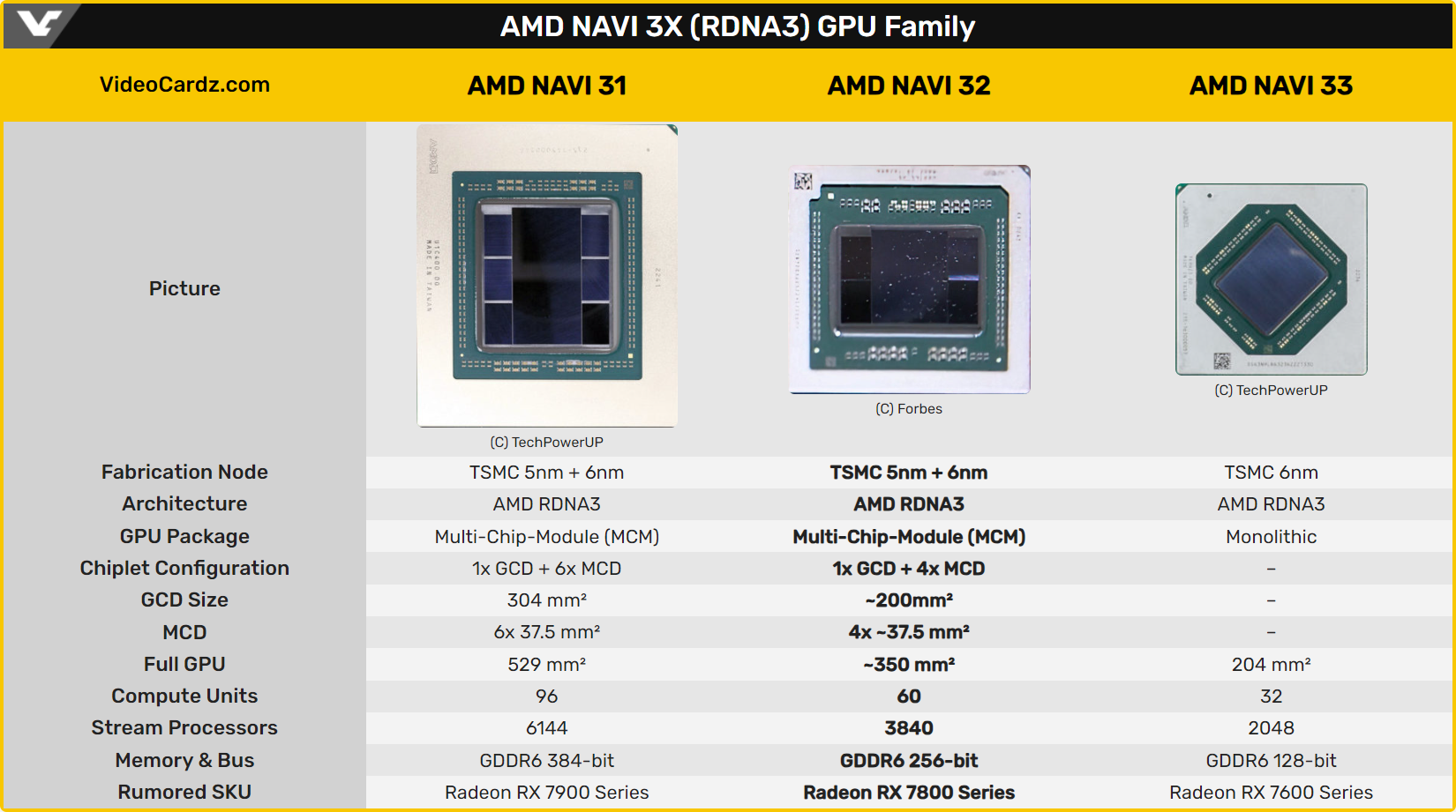 У вышеупомянутой модификации Navi 31 по бокам от микросхемы GCD (Graphics Compute Die) распаяны шесть кристаллов MCD (Memory Cache Die), однако два из них являются «заглушками». То есть в распоряжении этого графического процессора есть 64 мегабайта Infinity Cache и 256-разрядная шина памяти. Вероятно, чип GCD с вычислительными блоками тоже был урезан для соответствия конфигурации GPU Navi 32.