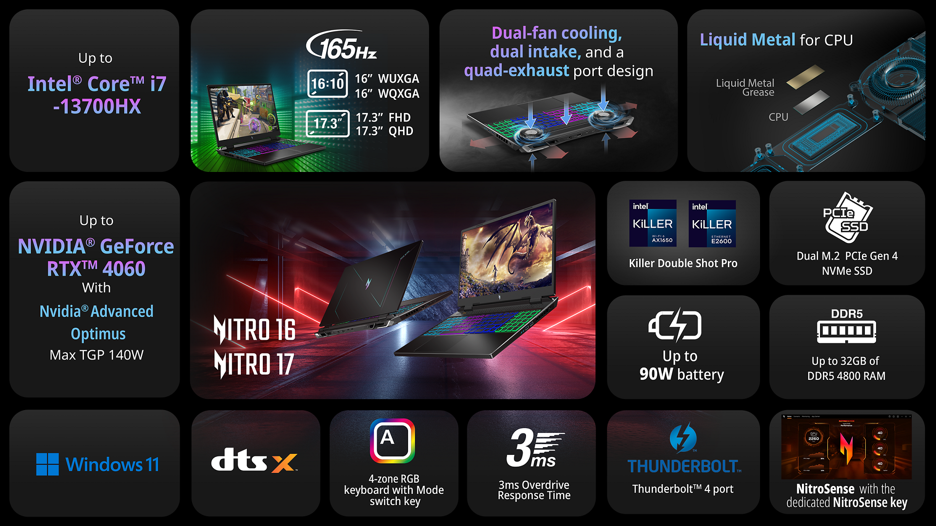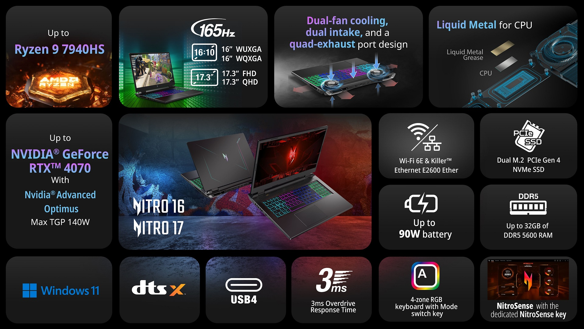 В топовой конфигурации Acer Nitro 16 и 17 оснащены процессором Intel Core i7-13700HX или AMD Ryzen 9 7940HS и видеоадаптером GeForce RTX 4060/4070 Laptop со 140-ваттным уровнем TGP. Заявлена поддержка до 32 Гбайт оперативной памяти DDR5-4800/5600 и пары твердотельных накопителей M.2 с интерфейсом PCI-E 4.0 x4. К главным особенностям ноутбуков вендор также относит тонкие рамки экрана и использование жидкого металла в качестве термоинтерфейса CPU.