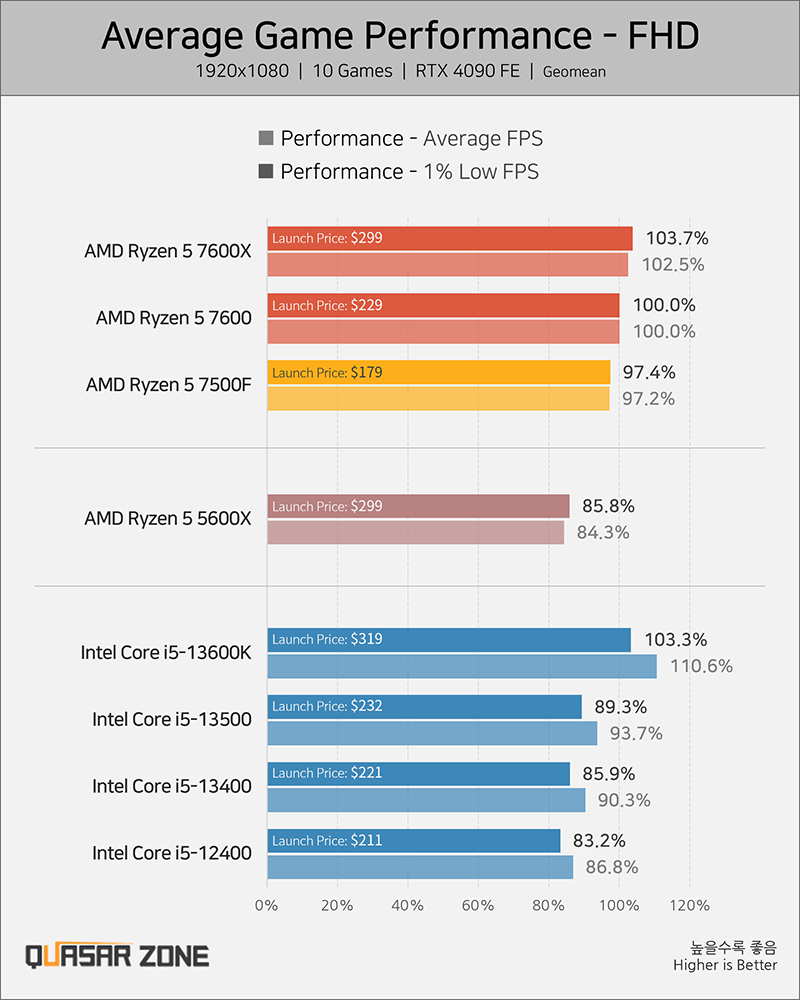 Между тем, в Сети начинают появляться обзоры нового процессора, например, от корейского веб-ресурса QuasarZone. AMD Ryzen 5 7500F показал себя очень неплохо и по игровой производительности лишь немного уступает Ryzen 5 7600. Если сравнивать с решениями конкурента, то Ryzen 5 7500F можно считать достойной альтернативой чипов Intel Core i5 13-го поколения.