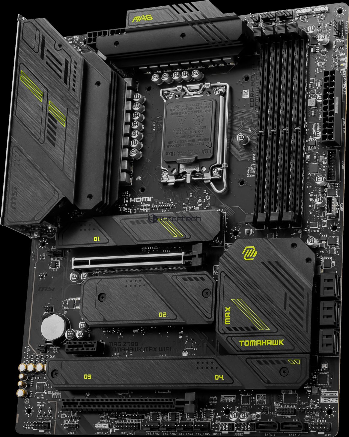 Ещё одной новинкой MSI станет материнская плата MAG Z790 Tomahawk Max WIFI. Оснащение этой модели включает 16-фазный блок VRM на 90-аперных сборках, четыре разъёма под модули DDR5-7200, беспроводной модуль Wi-Fi 7 и 2,5-гигабитный сетевой интерфейс.