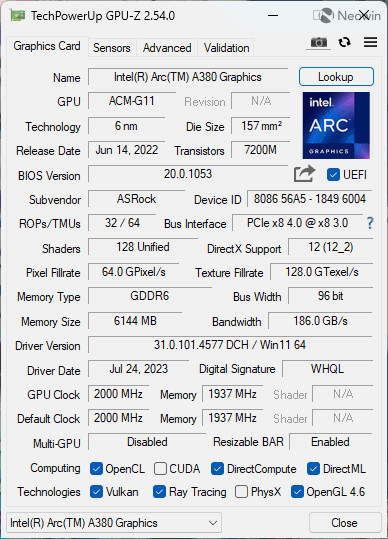 Частота графического процессора у Arc A380 после обновления драйвера выросла с 2,0 до 2,15 ГГц. Версия прошивки вместе с этим сменилась с 20.0.1053 на 20.0.1064. На скриншотах ниже приведены характеристики Arc A380 в исполнении компании ASRock. Какого-либо разгона видеопамяти GDDR6 при этом не предусмотрено.