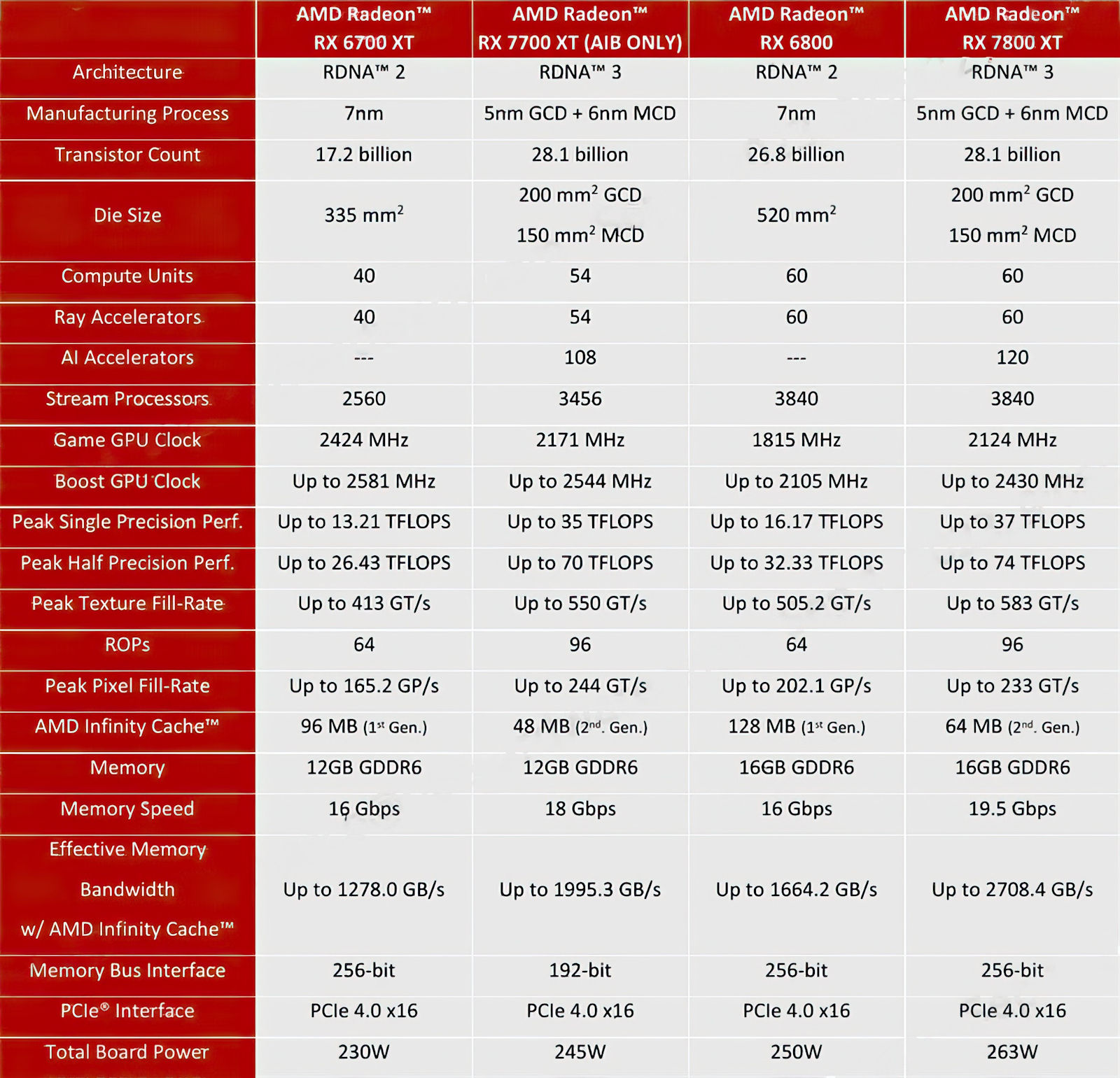 В основе новых видеокарт, как было сказано выше, лежит графический процессор Navi 32. Его полноценная конфигурация с 60 блоками Compute Units (или 3840 потоковыми процессорами), 64 мегабайтами Infinity Cache и 256-разрдяной шиной памяти используется в Radeon RX 7800 XT. Модель Radeon RX 7700 XT получила урезанный вариант с 54 блоками Compute Units (или 3456 потоковыми процессорами), 48 мегабайтами Infinity Cache и 192-битной шиной. Объём видеобуфера GDDR6 составляет 16 и 12 Гбайт соответственно.