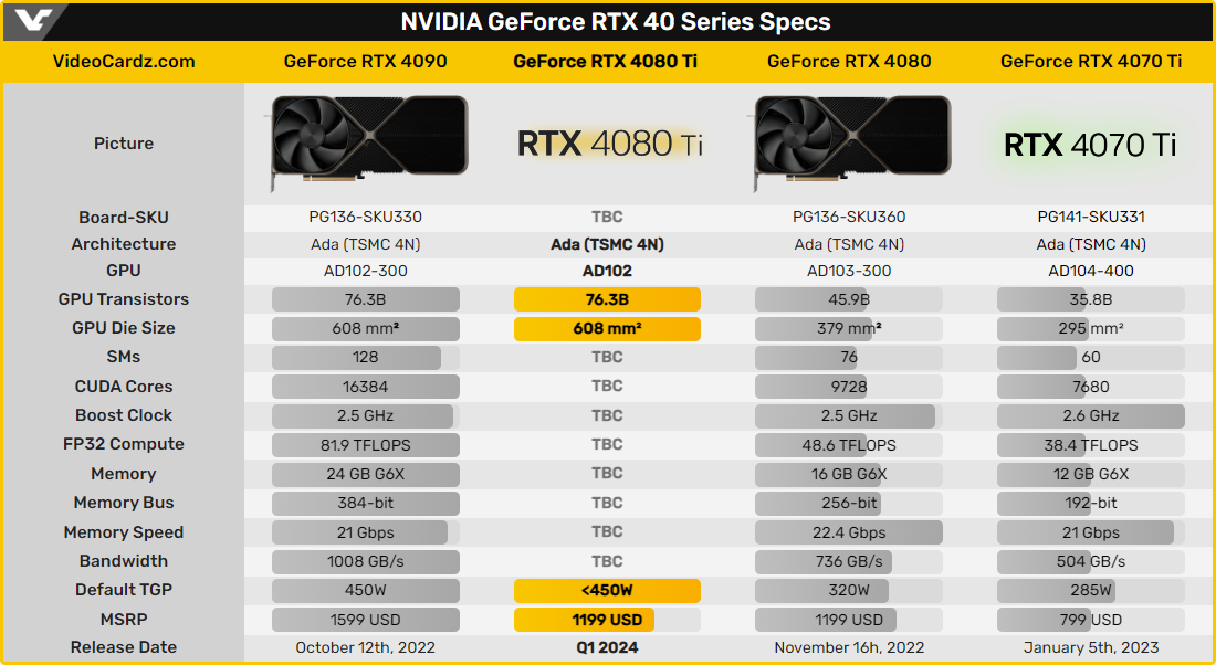 В основу GeForce RTX 4080 Ti/Super ляжет урезанная версия графического процессора Nvidia AD102. Этот GPU знаком по флагманской видеокарте GeForce RTX 4090, которая использует конфигурацию с 16 384 ядрами CUDA. Относительно количества CUDA-ядра у новой модели, к сожалению, на данный момент информации не поступало, но оно однозначно будет больше, чем у обычной GeForce RTX 4080 (9728 штук). Штатный уровень TGP составит менее 450 Вт.