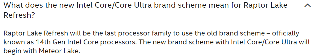 Мы уже знали, что в мобильном сегменте Intel скоро перейдёт на маркировку Core/Core Ultra. Это произойдёт с релизом семейства процессоров Meteor Lake, который запланирован на этот декабрь. В случае настольных чипов Intel должна перейти на новую схему маркировки в следующем году. Ориентировочно во второй половине 2024-го на рынок поступит массовая платформа LGA1851 и семейство чипов Arrow Lake-S.