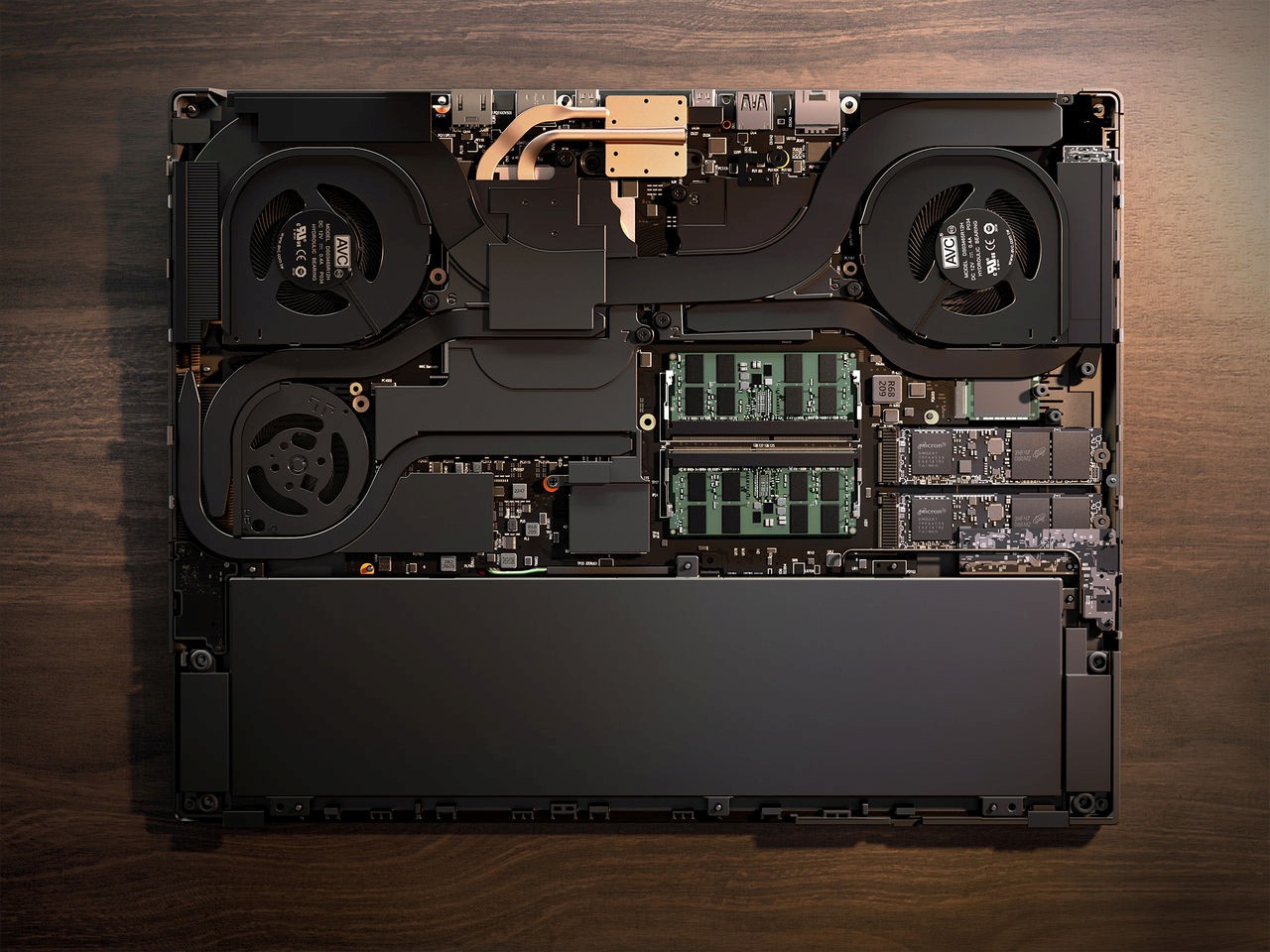 Корпус выполнен из прессованного карбонового волокна. Этот материал крепче алюминия и легче его. Крышка каждого ноутбука имеет уникальный узор на поверхности. Некоторые элементы выполнены из переработанного магния. Дополняет стильный внешний вид RGB-подсветка.