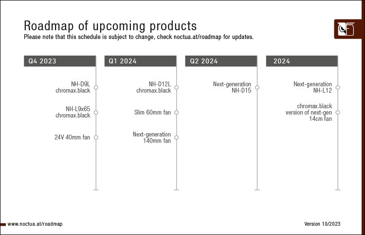 Австрийский производитель систем охлаждения Noctua раскрыл график выхода новых продуктов. В частности, до конца этого года компания планирует выпустить CPU-кулеры NH-D9L и NH-L9x65 в модификации chromax.black, а также 40-мм вентилятор с напряжением питания 24 В.