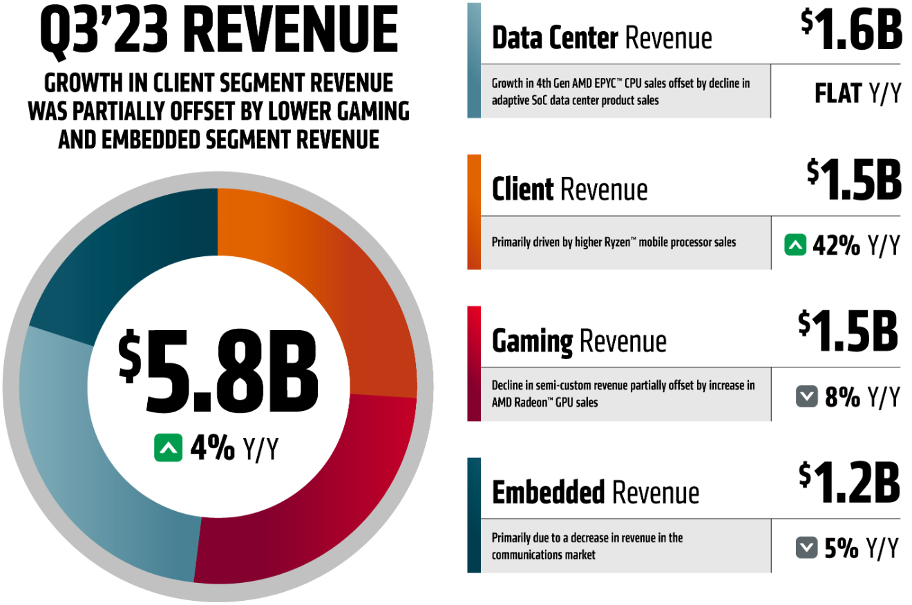 Следом за Intel финансовые итоги третьего квартала подвела компания AMD. Выручка «красного» чипмейкера за июль-сентябрь составила 5,8 миллиарда долларов, продемонстрировав 4% прирост относительно аналогичного периода 2022-го. В это же время чистая прибыль компании по сравнению с прошлогодними показателями выросла сразу на 353% — с $66 млн до $299 млн.