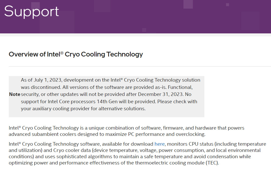 Идея использования элементов Пельте для охлаждения кремниевых чипов далеко не новая, но в потребительском сегменте остаётся уделом горстки энтузиастов. Задача по продвижению термоэлектрического охлаждения в массы оказалось не по силам даже корпорации Intel. По состоянию на первое июля этого года процессорный гигант свернул работу над технологией Cryo Cooling, гласит объявление на официальном сайте.