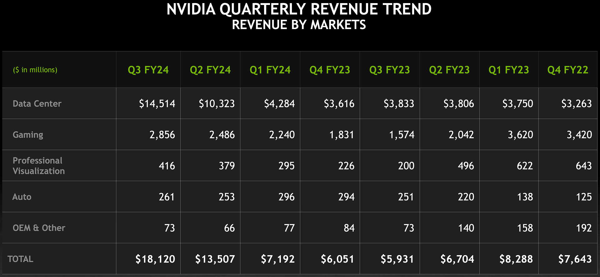 Уже больше года львиную долю доходов Nvidia получает от продажи решений для дата-центров. В прошлом квартале соответствующее подразделение принесло компании $14,5 млрд (+279% относительно прошлого года). Для сравнения, выручка игрового подразделения по итогам предыдущих трёх месяцев в пять раз меньше — 2,85 миллиарда долларов (+81% относительно 2022-го).