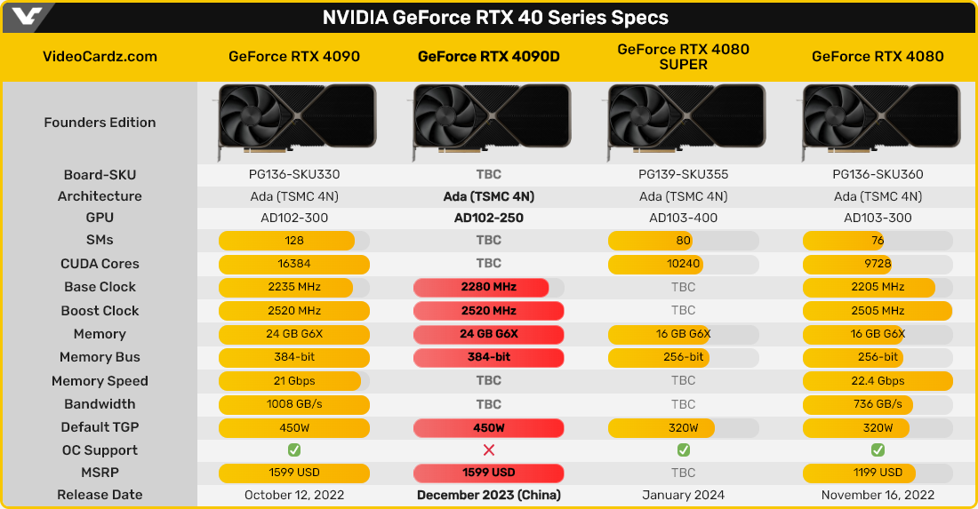 Основой GeForce RTX 4090D послужит графический процессор Nvidia AD102-250. Его точная конфигурация пока не сообщается, однако он будет несколько урезан относительно GPU AD102-300, используемого в полноценной GeForce RTX 4090. Обновлённой видеокарте также приписывается 425-ваттный уровень TGP и отсутствие поддержки оверклокинга. Всё это призвано снизить производительность GeForce RTX 4090D до того уровня, при котором она не будет нарушать требования США.