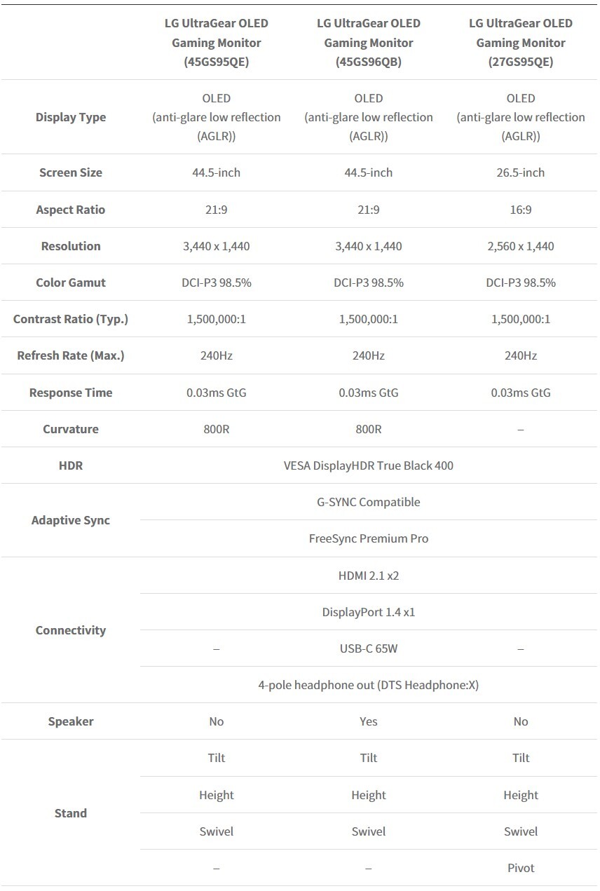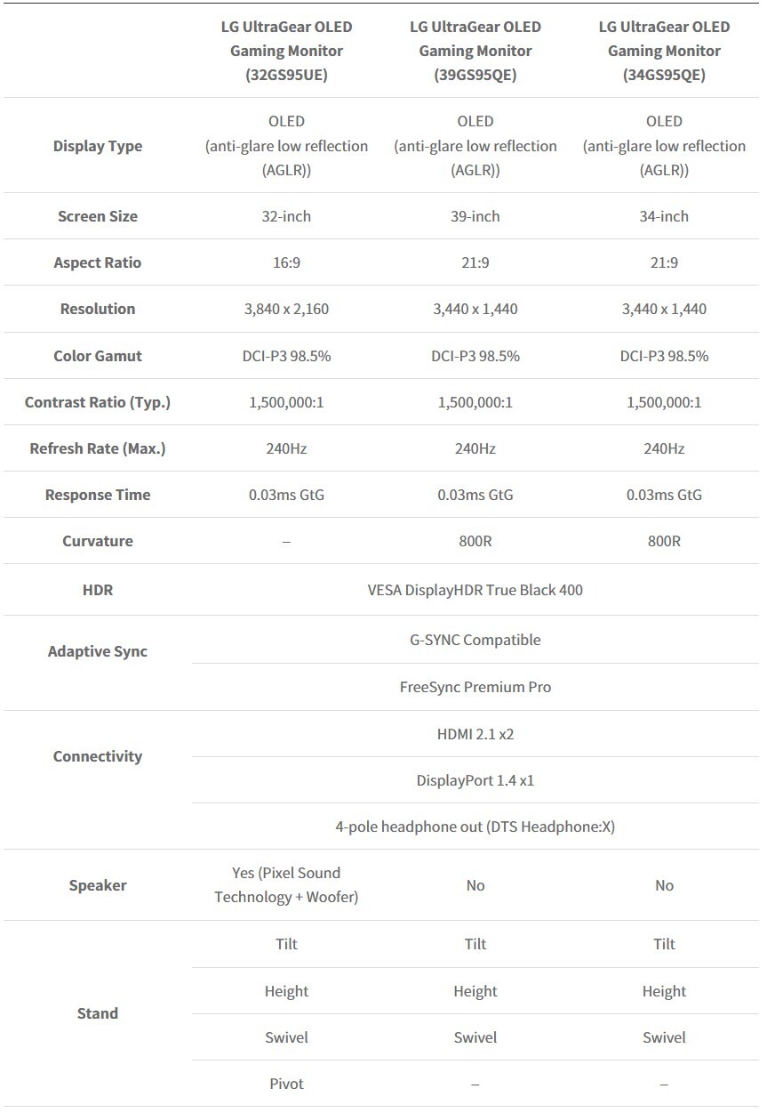 Однако при желании LG UltraGear 32GS95UE можно легко переключить в режим с разрешением 1080p, заодно увеличив частоту обновления до 480 Гц. Эта функция, к примеру, может быть актуальна во время игры в онлайн-шутеры. Из прочих особенностей монитора стоит отметить 98,5% охват палитры DCI-P3, контрастность 1,5 млн к 1 и время отклика 0,03 мс (от серого к серому). Спецификации всех новых мониторов LG UltraGear приведены ниже.
