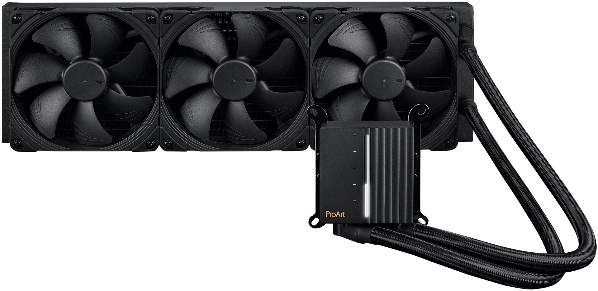 В системе охлаждения ASUS ProArt LC 420 также использованы 450-мм шланги с оплёткой и водоблок с медной контактной пластиной и встроенной помпой. Толщина радиатора составляет 30 мм. Интересной особенностью новинки стал светодиодный индикатор, встроенный в крышку водоблока. Он, к примеру, может отображать уровень нагрузки системы или скорость вентиляторов. В список поддерживаемых платформ входят Intel LGA115x, LGA1200, LGA1700, AMD AM4 и AM5.
