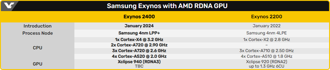 Спецификации графического блока Xclipse 940, к сожалению, пока не сообщаются. Известно, что компанию ему составили десять ARM-ядер с частотой до 3,2 ГГц, а для выпуска однокристальной системы использован 4-нм техпроцесс Samsung LPP+. Основные характеристики Exynos 2400 и Exynos 2200 со встроенной графикой AMD RDNA приведены ниже.