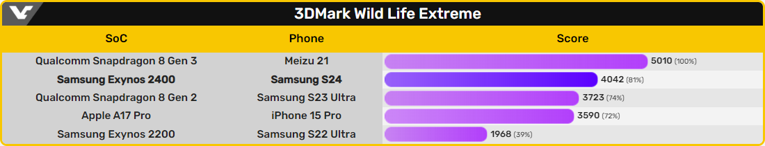 Смартфон на базе Samsung Exynos 2400 был испытан в бенчмарке 3DMark Wild Life. Новинка завершила его с показателем 4042 балла, что в два раза выше показателей Exynos 2200 и, к примеру, не хуже результатов Qualcomm Snapdragon 8 Gen2 и Apple A17 Pro. Более подробная информация о производительности станет доступна в ближайшие недели.
