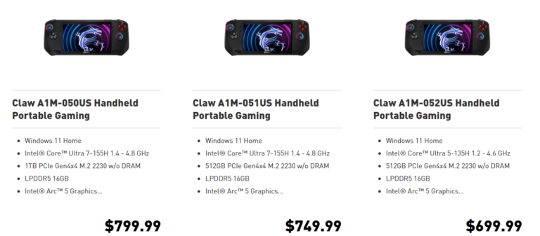 Компанию вышеупомянутым чипам составят 16 Гбайт оперативной памяти LPDDR5. Добавим, что MSI также рассматривала возможность оснастить Claw вдвое большим объёмом ОЗУ, но, как видим, отказалась от этой идеи. Хранилище будет представлено NVMe-накопителем с интерфейсом PCI-E 4.0 x4 вместимостью 512 Гбайт или 1 Тбайт, также есть слот для карт памяти microSD. Рекомендованные цены и конфигурации MSI Claw следующие: