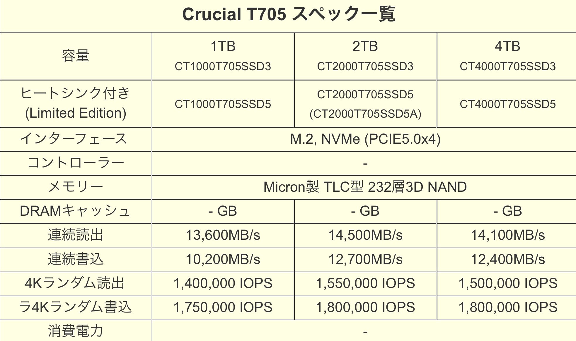 Наибольшими скоростными показателями сможет похвастаться 2-терабайтная модель. Для неё заявлены скорости до 14,5/12,7 Гбайт/с и быстродействие до 1,55/1,8 млн IOPS (чтение/запись). Параметры остальных версий приведены ниже. Также известно, что Crucial предложит накопители T705 в версии Limited Edition с белым радиатором.