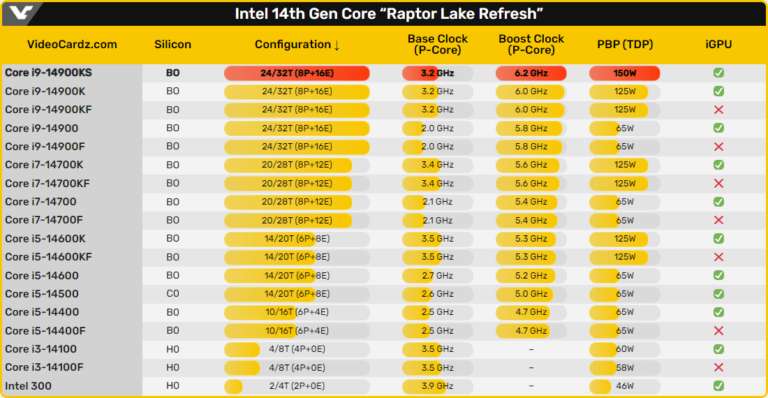 Как и ожидалось, главная особенность Core i9-14900KS кроется в увеличенном до 6,2 ГГц параметре Max Turbo Frequency для P-ядер, при этом базовый показатель остался на отметке 3,2 ГГц, как и у выпущенного ранее Core i9-14900K. Вместе с тактовыми частотами у новинки вырастут «аппетиты». Показатель Processor Base Power вместо 125 Вт составит 150 Вт, а под нагрузкой, если верить первым тестам, процессор может потреблять свыше 400 Вт.