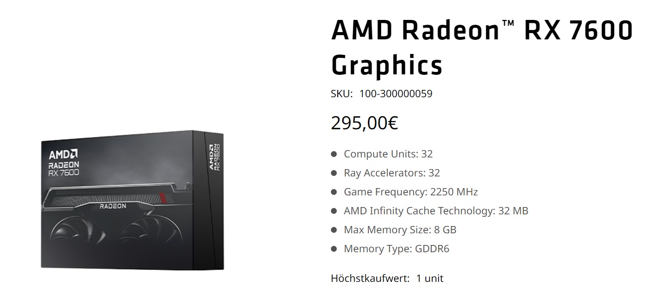 В настоящее время приобрести эталонный вариант AMD Radeon RX 7600, к примеру, в Германии можно за 295 евро. Это в целом соответствует рекомендованной цене видеокарты для европейского рынка, то есть каких-то скидок в настоящее время не предусмотрено. О том, на что способна Radeon RX 7600, мы рассказывали на примере модели ASUS Dual.